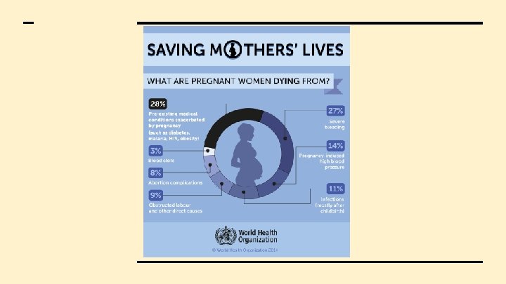 Causes (cont. ) Hypertensive disorders contribute to about one in six maternal deaths in Southeast Asia, and numerous other indirect causes of death indicate a prevalence of infectious diseases, such as malaria and HIV Another significant factor in maternal death is the practice of unsafe abortions, which are much more common in third-world countries such as Cambodia and Vietnam where it can be exceedingly difficult for impoverished mothers to find reliable, safe clinics Maternal deaths in developing countries are preventable through adequate nutrition, proper health care, including access to family planning, the presence of a skilled birth attendant during delivery, and emergency obstetric care