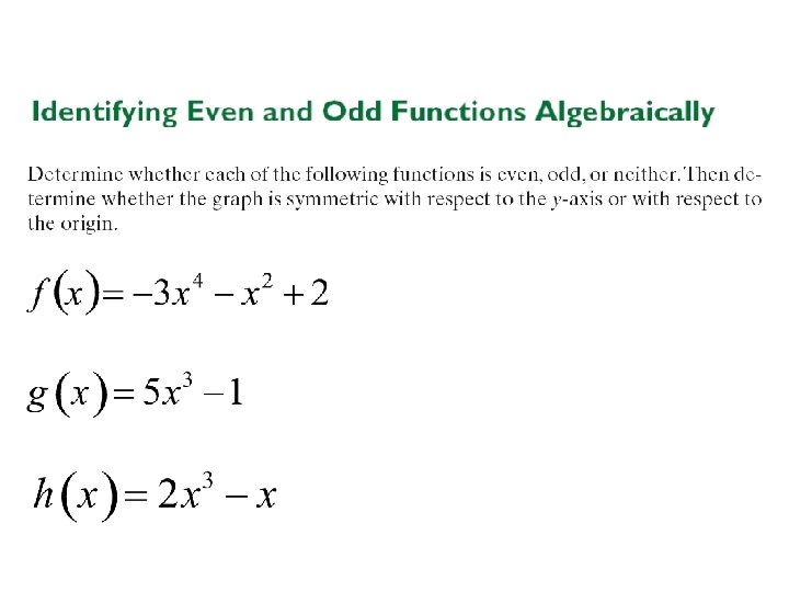 Symmetry of a Function (Odd or Even) • If a function f satisfies f (–x) = f (x) for every number x in its domain, then f is called an even function. The graph of an even function is symmetric with respect to the y-axis • If f satisfies f (–x) = –f (x) for every number x in its domain, then f is called an odd function. The graph of an odd function is symmetric about the origin An even function Figure 19