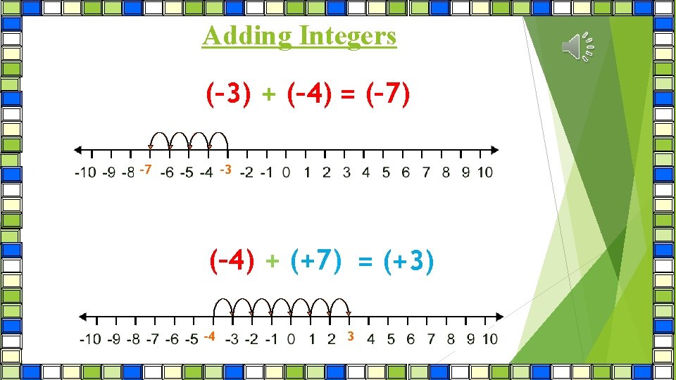 Adding Integers When adding integers …. (-5) + (-2)= (-7) Starting place Starting Place Direction Distance -10 -9 -8 -7 -6 -5 -4 -3 -2 -1 0 1 2 3 4 5 6 7 8 9 10 HINT! Write down a number line!!