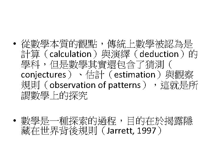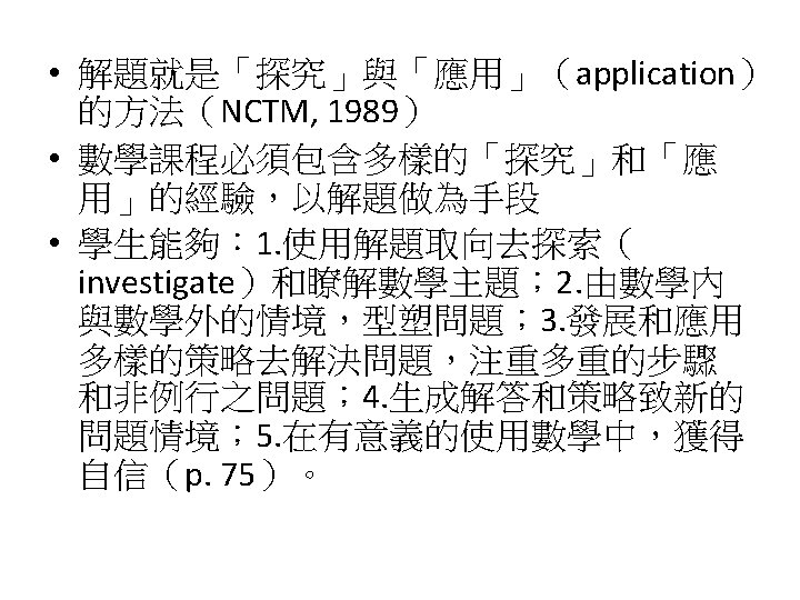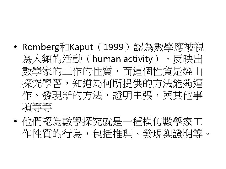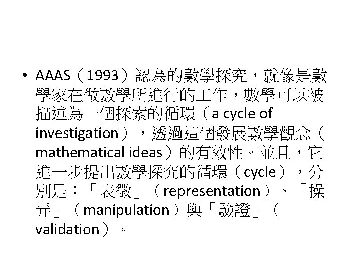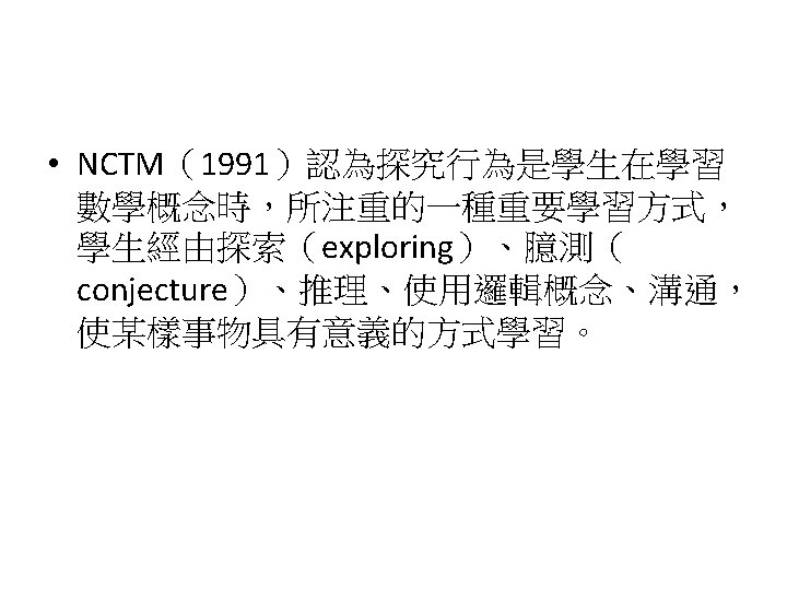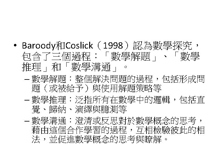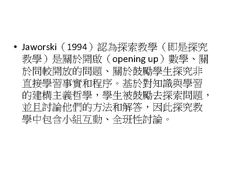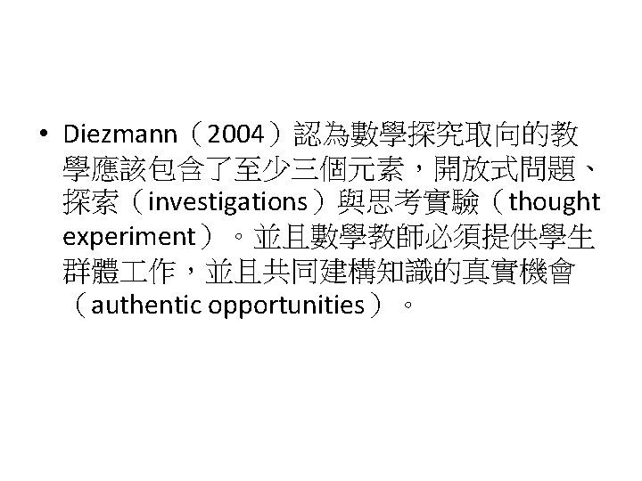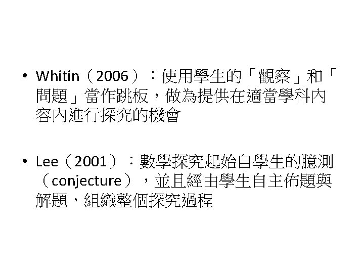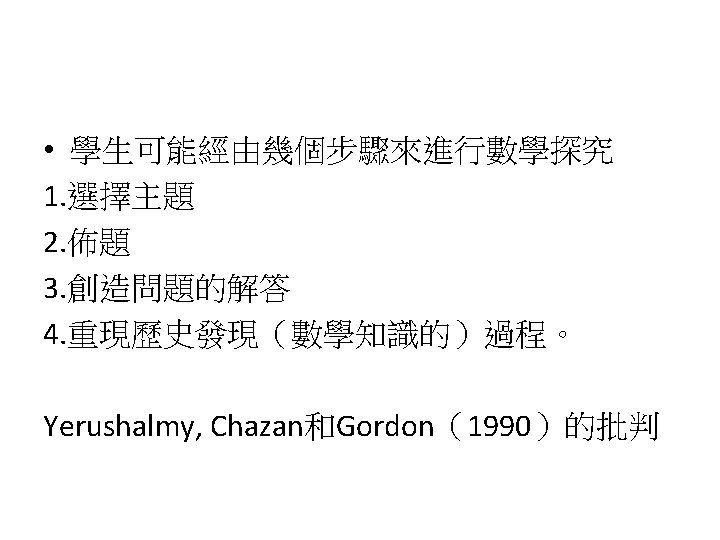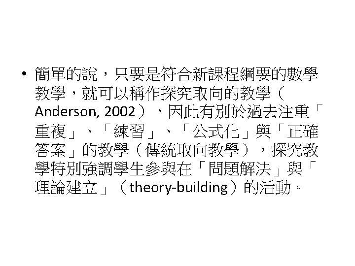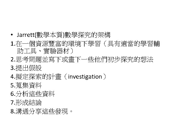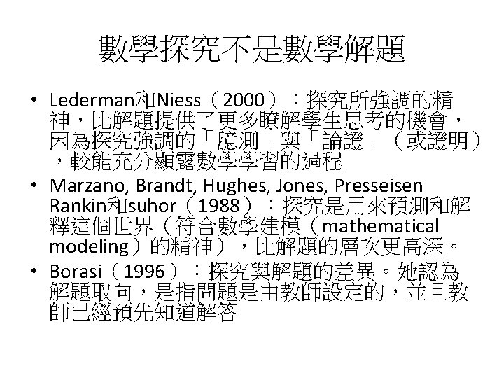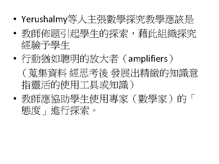Siegel, M. , Borasi, R. , & Fonzi, J. (1998). Supporting students' mathematical inquiries through reading. Journal for Research in Mathematics Education, 29(4), 378 -413. 1. 2. 3. 4. 5. 6. 7. 8. Modeling Making explicit the purpose of an inquiry learning experience Synthesizing and reflecting on the results of an inquiry experience Orchestrating and facilitating students' inquiry when working in small groups Orchestrating and facilitating students' inquiry when working individually Orchestrating and facilitating "sharing"sessions where students communicate the results of their inquiries Orchestrating and facilitating students' inquiry when working as a whole class Responding to the learning needs of diverse students in inquiry math classes