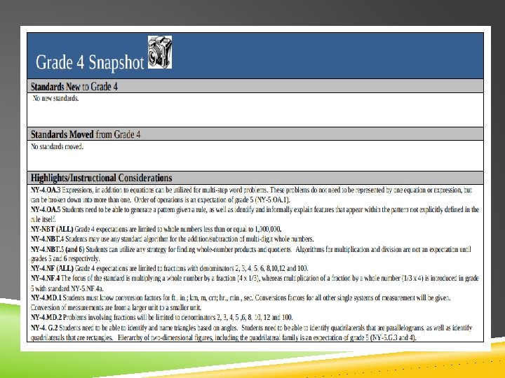 4 th Grade Overview In Grade 4, instructional time is focused on three areas: (1) developing understanding and fluency with multi-digit multiplication, and developing understanding of dividing to find quotients involving multi-digit dividends (2) developing an understanding of fraction equivalence, addition and subtraction of fractions with like denominators, and multiplication of fractions by whole numbers (3) understanding that geometric figures can be analyzed and classified based on their properties, such as having parallel sides, perpendicular sides, particular angle measures, and symmetry. http: //www. nysed. gov/common/nysed/files/programs/curriculum-instruction/nys-next-generation-mathematics-p -12 -standards. pdf