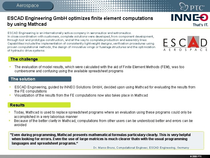 Reference Statements “As Britain’s largest defence contractor, we need the best tools available such as Mathcad for our engineers. Anything less would be unacceptable. — Mark Conlin, Analysis Development Group Leader “I depend on Mathcad to be my tool for everything I do during the design process, from planning and executing our technical calculations to reporting… We conduct all team calculation work and reporting with Mathcad. It makes the process so streamlined that I can't imagine work without it. ” — Michael Ekholm “Mathcad provides me a standardized way to communicate. We have manufacturing in Mexico & key vendors in China. We're doing a field trial in Korea. We need to be able to share documents that all these people will understand. The one Language that's universal is mathematics. " — Mark Beigert © 2006 PTC
