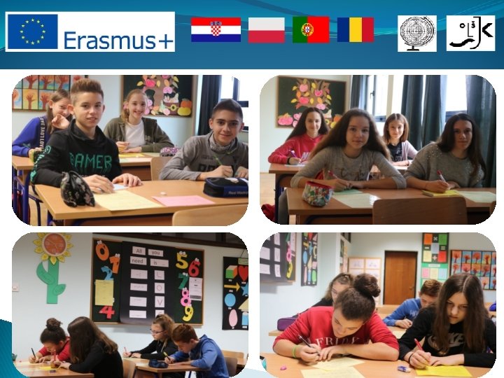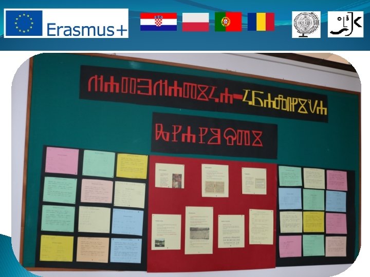 Description of the 2 nd activity: 7 th graders have already been familiar with Glagolitc script and letters during so far school education, in elementary school education. During the workshop Glagolitic script and Mathematics , students were discovering, for the first time, that each Glagolitic letter also presents one number so they can also write numbers and solve different mathematical operations. In preamble of the workshop, students reminded themselves what Glagolitic script is, its characteristics and importance for Croatian culture and history. Students were filling in worksheets with information about the Baška Tablet, the most important Croatian Glagolitc monument. Students had to write numeric data of the Baška Tablet in numbers of Glagolic script. In central part of the workshop students were, in pairs, solving Mathematics exercises in Glagolitic script. Works, made during the workshop, were exposed on school billboard dedicated to the project.