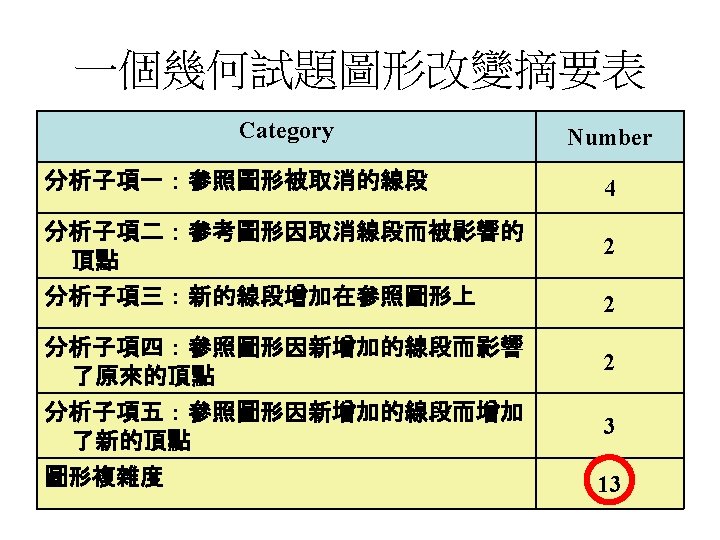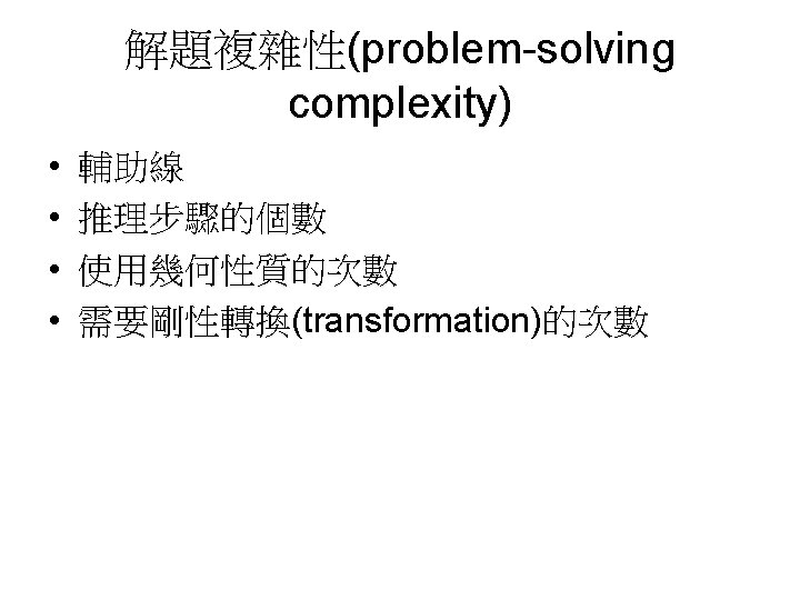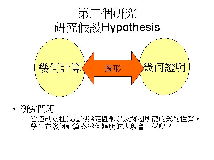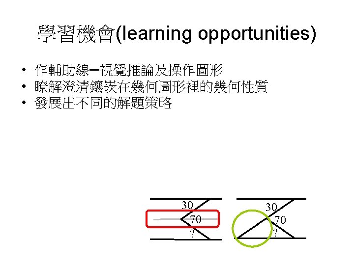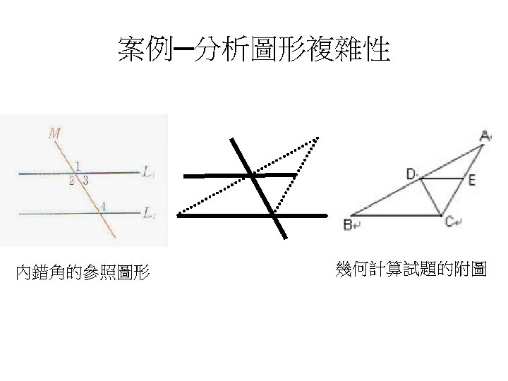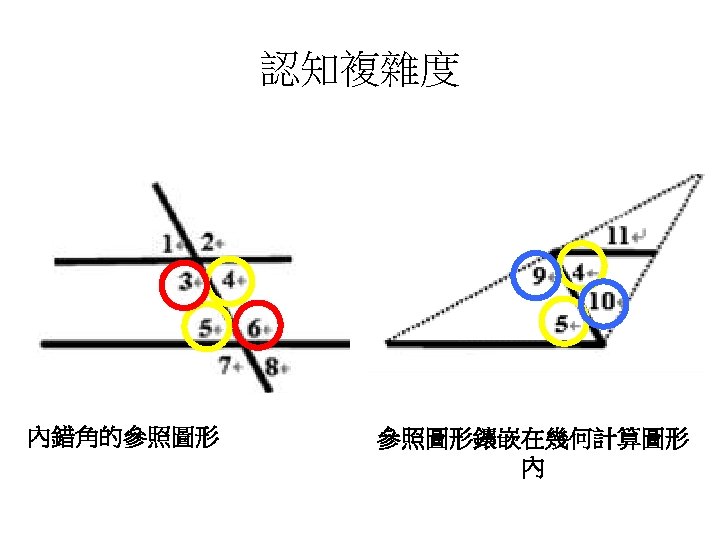 Why Geometric Diagram? • Place where problem solving happens (Larkin & Simon, 1987) • Schemes by which students remember the steps in solving a problem, the given statements, and the diagram labels (Lovett & Anderson, 1994) • Milieu where can be parsed into chucks to cue the geometric knowledge (Koedinger & Anderson, 1990) • Artifacts in scaffolding students in learning proofs (Cheng & Lin, 2006; 2007). • Both types of tasks also require to visualize the geometric properties embedded in the given diagram