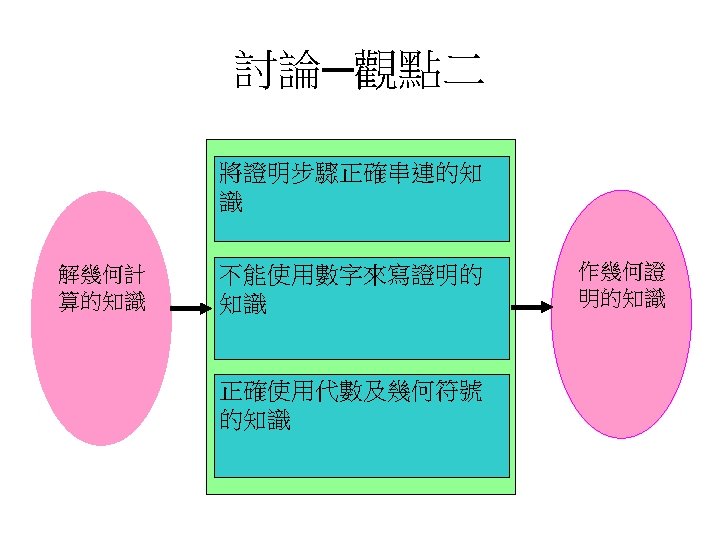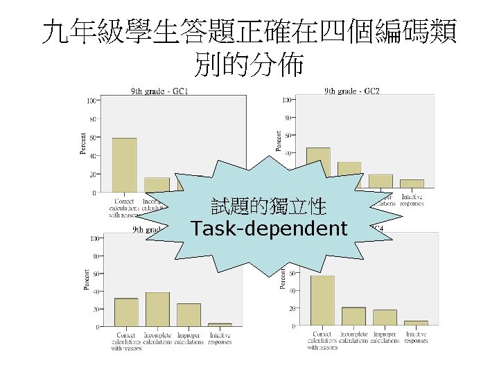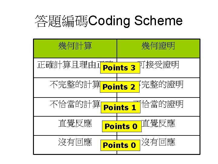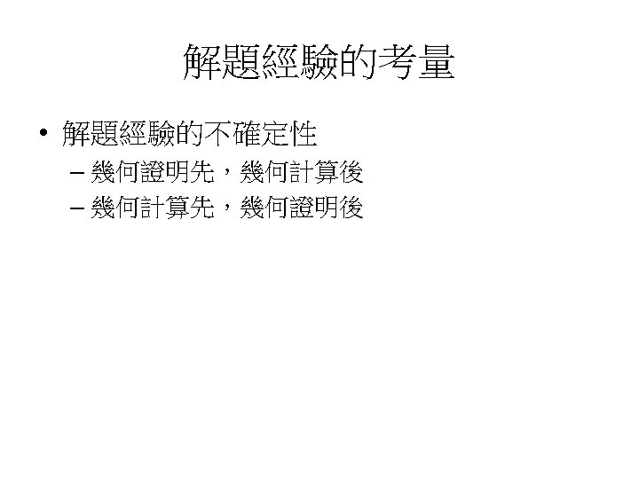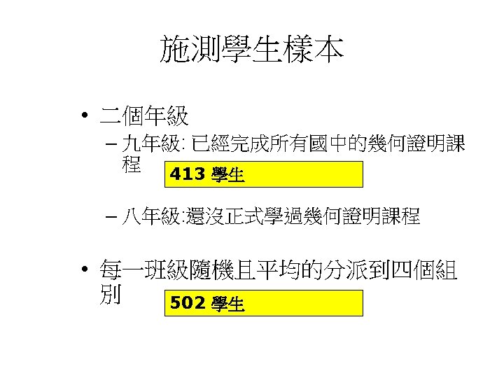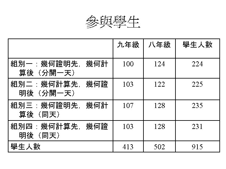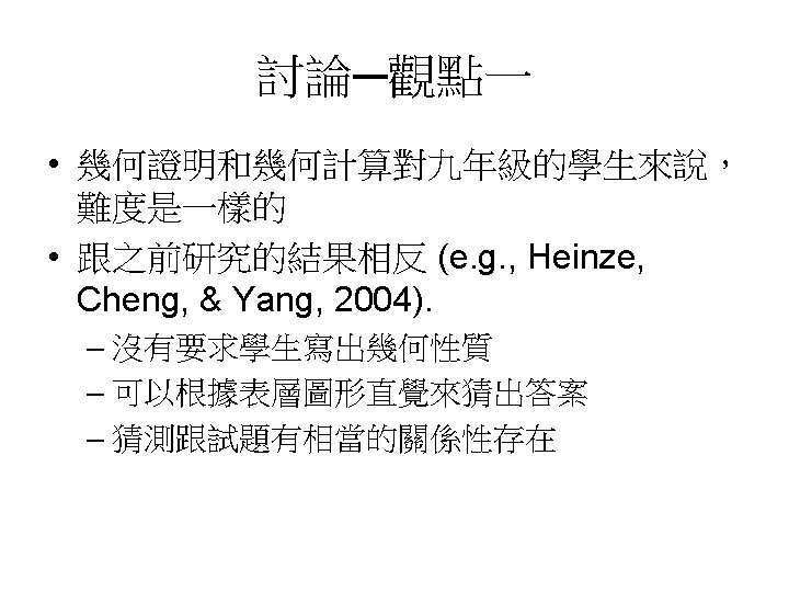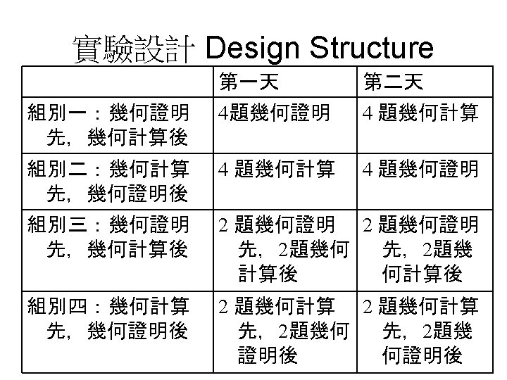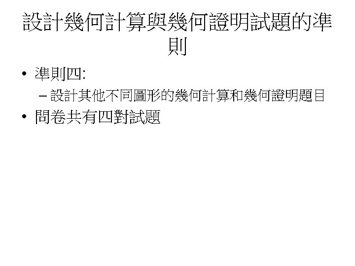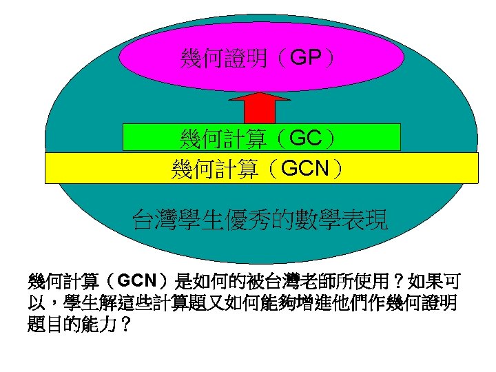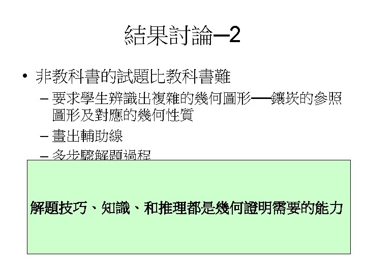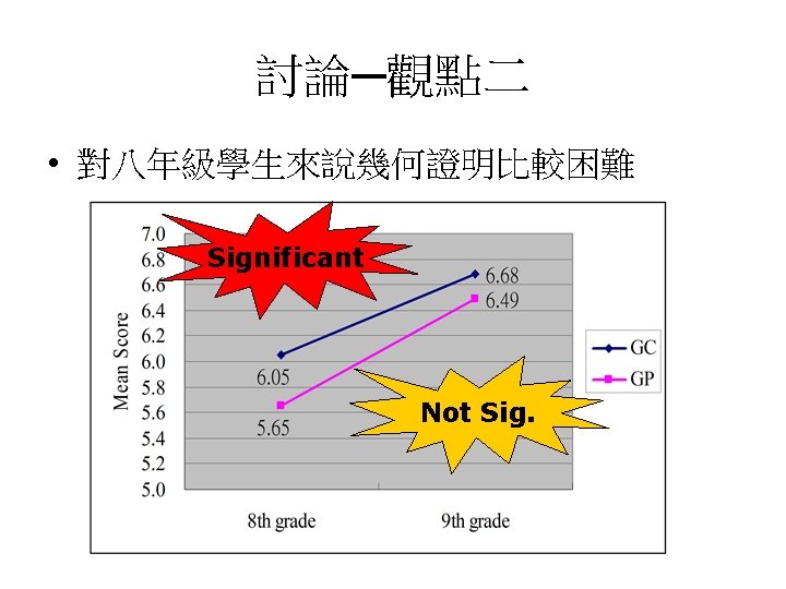 幾何計算與幾何證明的表現比較( 兩個年級一起) T test and P value Mean GCN 6. 33 GP 6. 03 Mean Std. Error Differenc Mean e -. 305 . 068 T -4. 508 df Sig. 914. 000*