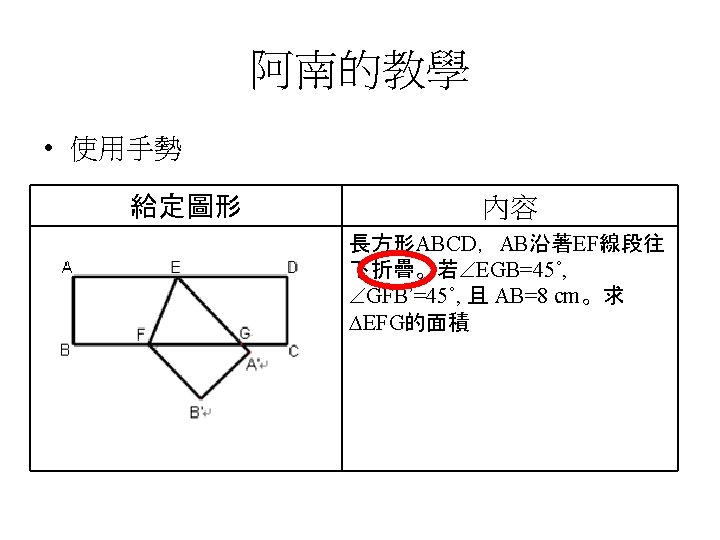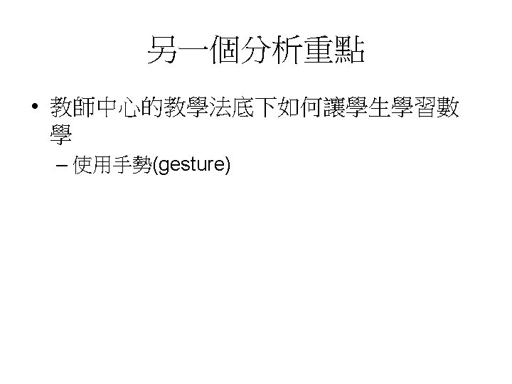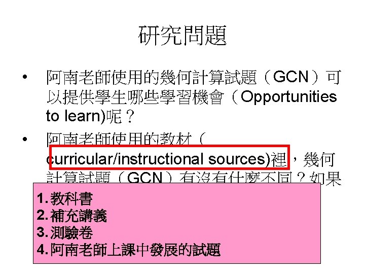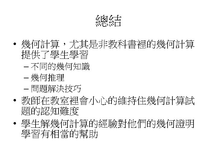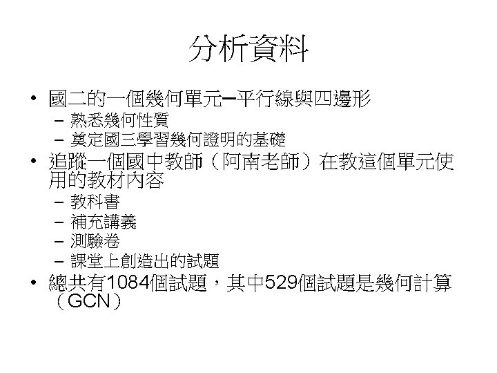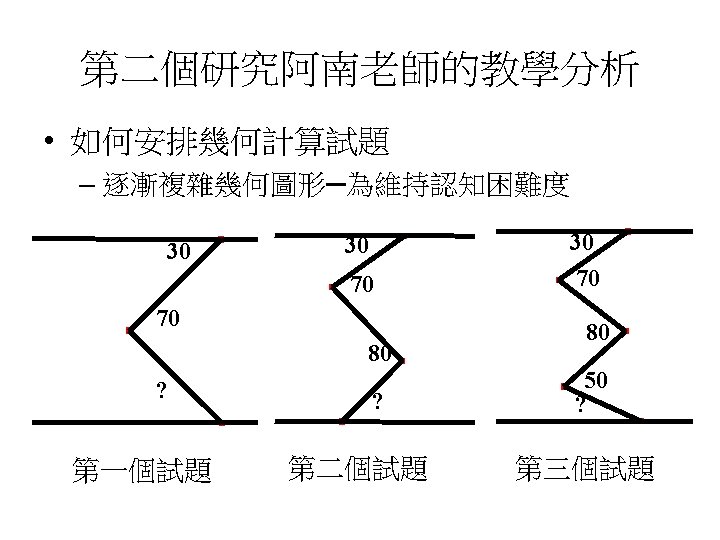 Mathematical Task Framework Excellent Mathematical Knowledge for Teaching (MTF) TASKS as enacted as set up by 教師中心 by classroom teacher and teacher students TASKS as they appear in curricular/ instructional materials Student Learning 考試導向 一位台灣國中數學教師─ 阿南老師 第一個研究 第二個研究 總結 第三個研究