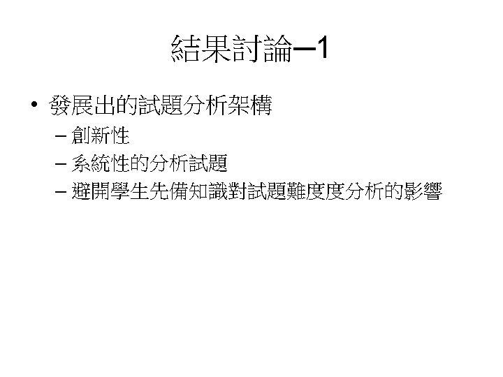 Implications • 課程分析的兩種方式:Vertical-dimension (textbook) vs. horizontal-dimension investigations • 使用MTF架構可有效的探究學生的學習成果 • 未來研究應小心的考量亞洲國家的數學成就表現。 尤其是 – 考試文化Examination culture – 非語言的教室互動模式Non-verbal communications (e. g. , the use of gestures)