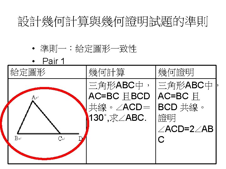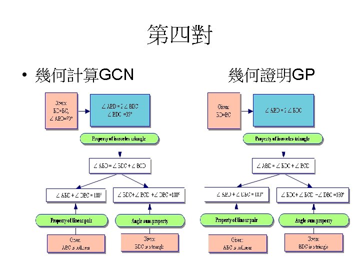 第四對 Given Diagram D E C B A GCN Item GP Item 三角形BDC中,三角形BDC BD=BC 且ABC 中,BD=BC 共線。 ABD 且ABC 共線。 = 70˚, 求 證明 BDC. ABD=2 B DC