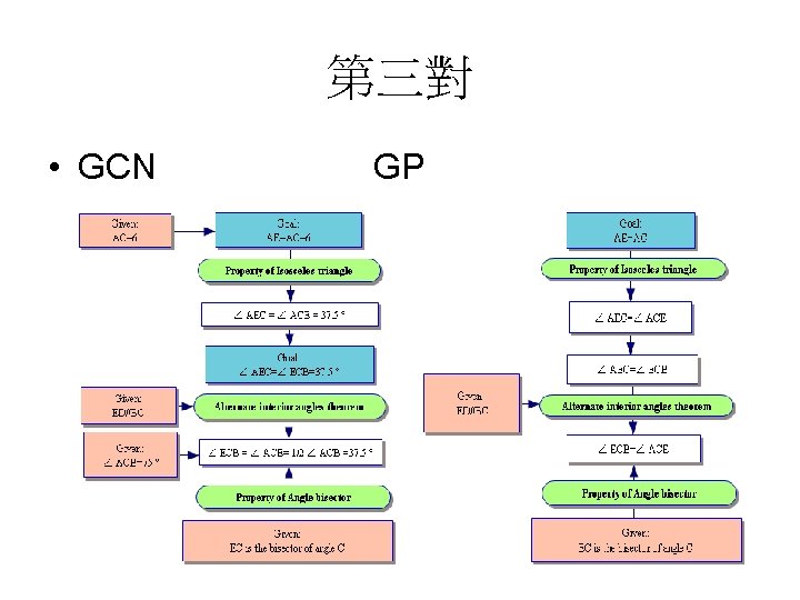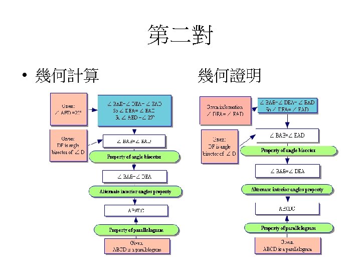 第二對 Given Diagram GCN Item ABCD is a A parallelogram. AE and BF are angle bisectors D of A and B. If AED=25∘, F B find the E measure of EAD. C GP Item ABCD is a parallelogra m. AE and BF are angle bisectors of A and B. Prove AED= EA D.