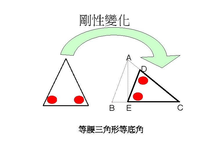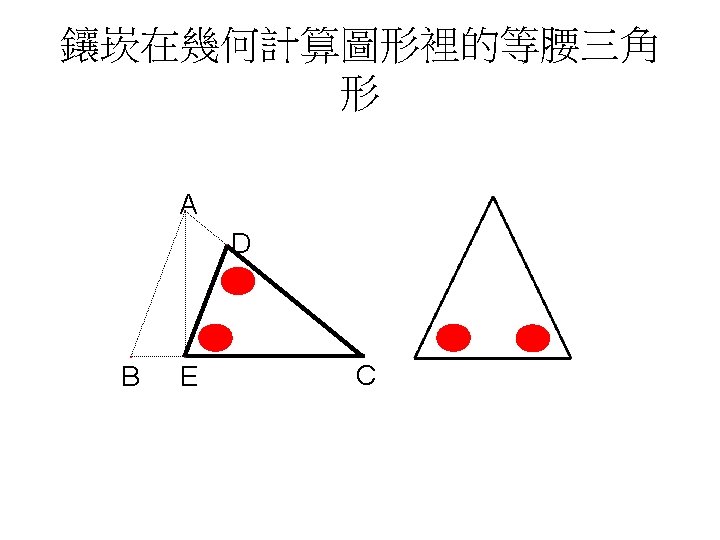 第三對 Given Diagram A E B C GCN Item Triangle ABC in which AB and AC are the same lengths. Construct a line through point A so that the D line is parallel to BC where the bisectors of angle B and angle C intersect the line at point D and point E. If AC=6 cm and ∠ACB=75∘, find (1) the length of AE; (2) the measure of ∠AEC. GP Item Triangle ABC in which AB and AC are the same lengths. Construct a line through point A so that the line is parallel to BC and the bisectors of angle B and angle C intersect the line at point D and point E. Prove AC=AE