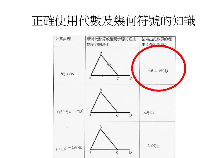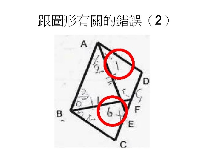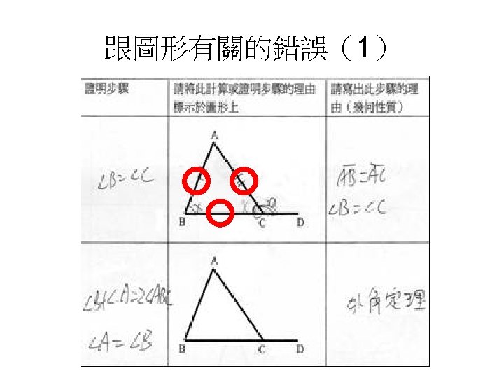 跟圖形有關的錯誤(3) Proving step Labels on the diagram Geometric reasons Two parallel lines. Sum of the alternate interior angles is 180˚