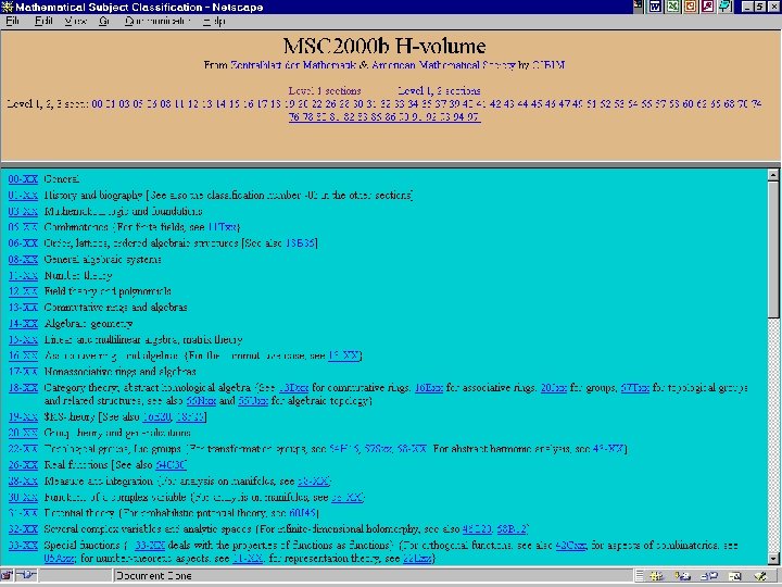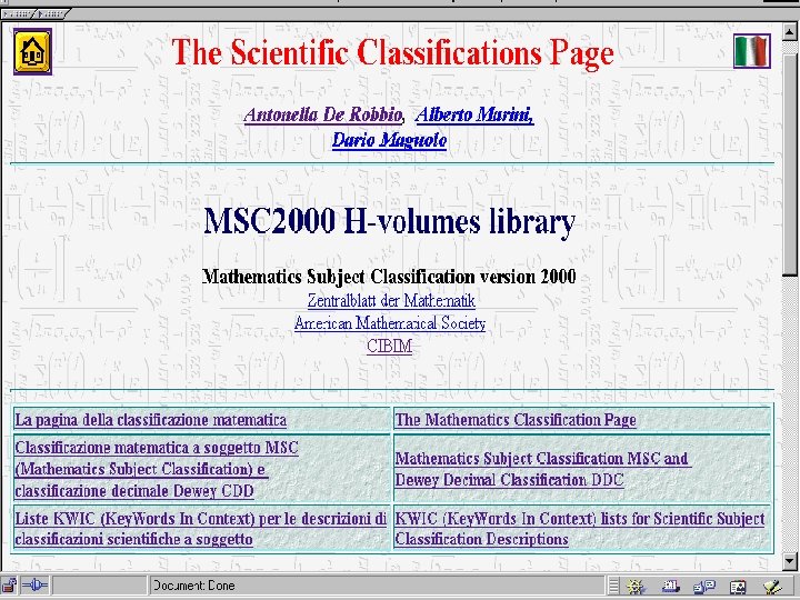 The Mathematics Classification Page MSC 2000 in: l simple frame presentation – – – l English text Italian translation interleaved English and Italian texts with marks of changes from MSC 1991 with links to subject specific pages of relevant Websites double view presentation – English text