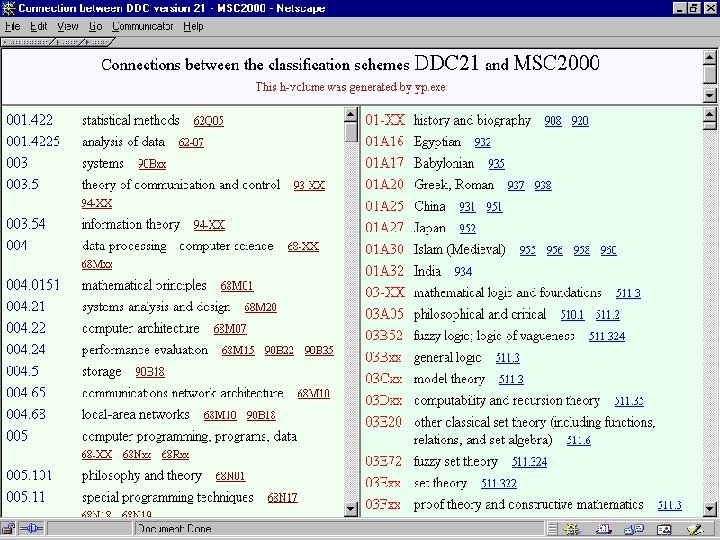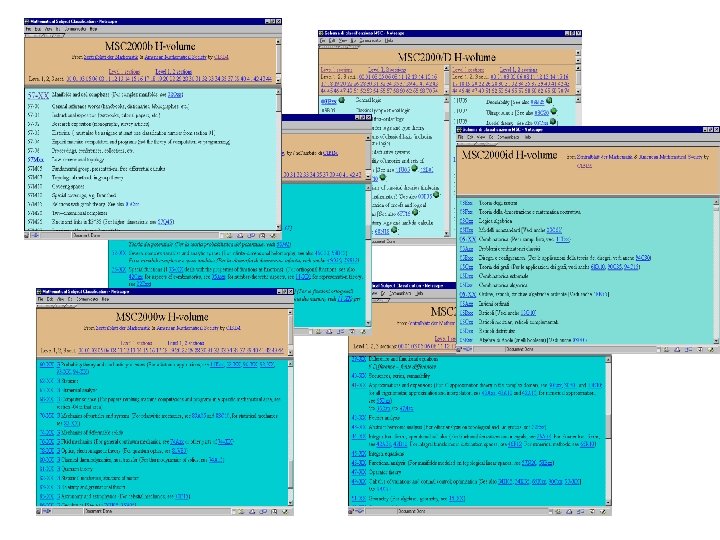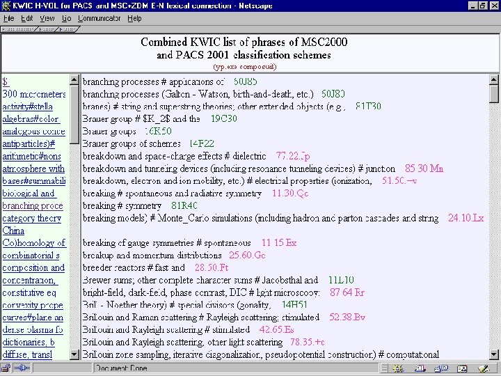 Relating Scientific Subject Classifications linked categories in double view presentation of: l ACM CCS (1998) and MSC 2000 separate KWIC lists of descriptions of: l MSC 2000 l PACS 2001 l ACM CCS (1998) – English text with appended Italian text a combined KWIC list of descriptions of: l MSC 2000 and PACS 2001 l MSC 2000 and ACM CCS (1998)