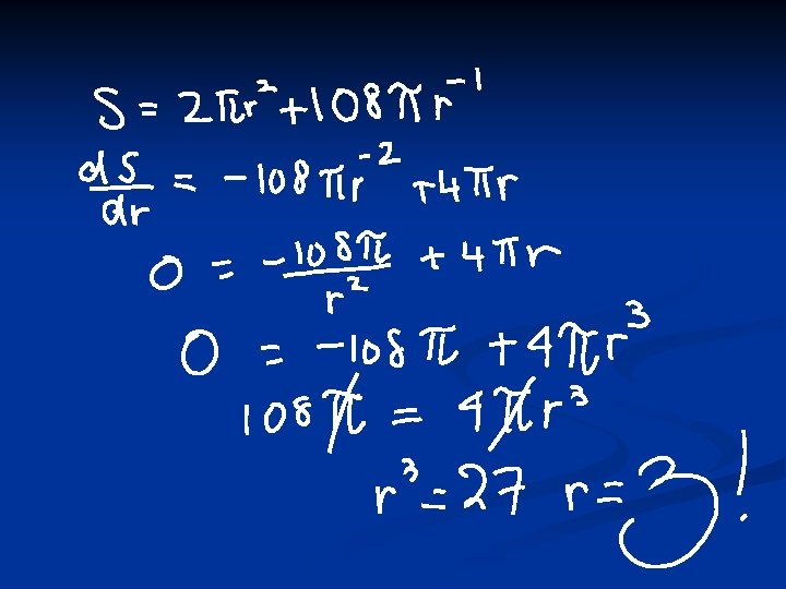 Hints! n n n Steps: 1) Find the volume of the cylinder and let this equal 54. Make h the subject of this formula. 2) Find an expression for the total surface area. 3) Substitute what you got in 1) into the total surface area expression from 2) to give you S in terms of r. 4) Find the derivative of this expression to find the stationary values and determine their nature by using the second derivative. 5) Find the corresponding height.
