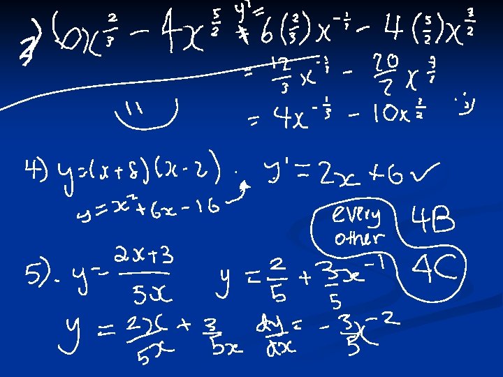 Example 4 n Find the derivative of Y= 3 x - 1+1/5 x 2 +x 4 n The derivative is 3 + 2/5 x + 4 x 3