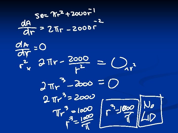 A beautiful application problem n Jordan wants to design a drink container for orange juice in the shape of a cylinder with NO lid. The volume of the orange juice is 1000 cc. Show that the surface area of this container with NO lid is given by n Show that when the rate of the change of the area with respect to r is zero then r 3= 500/