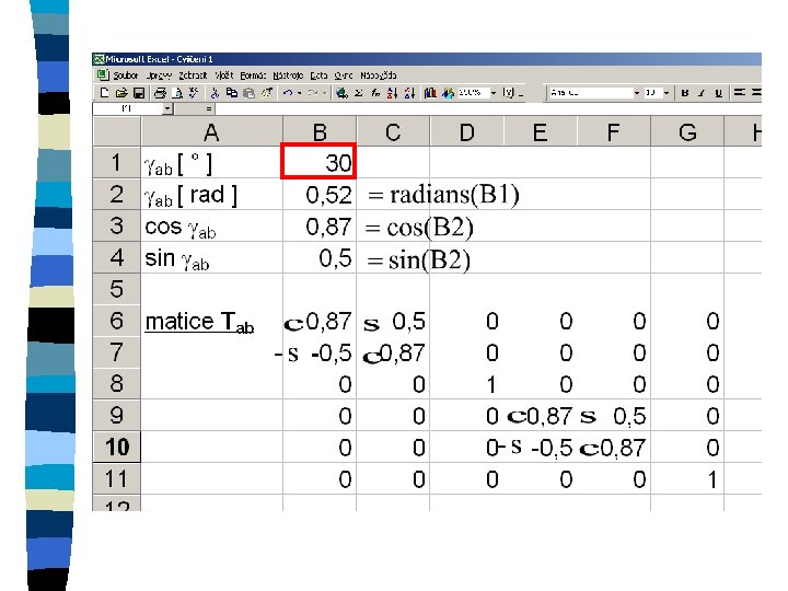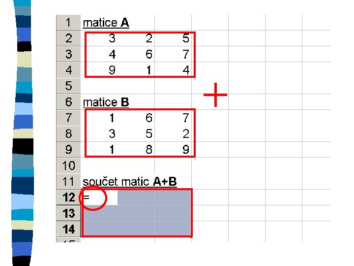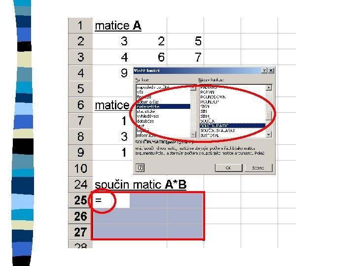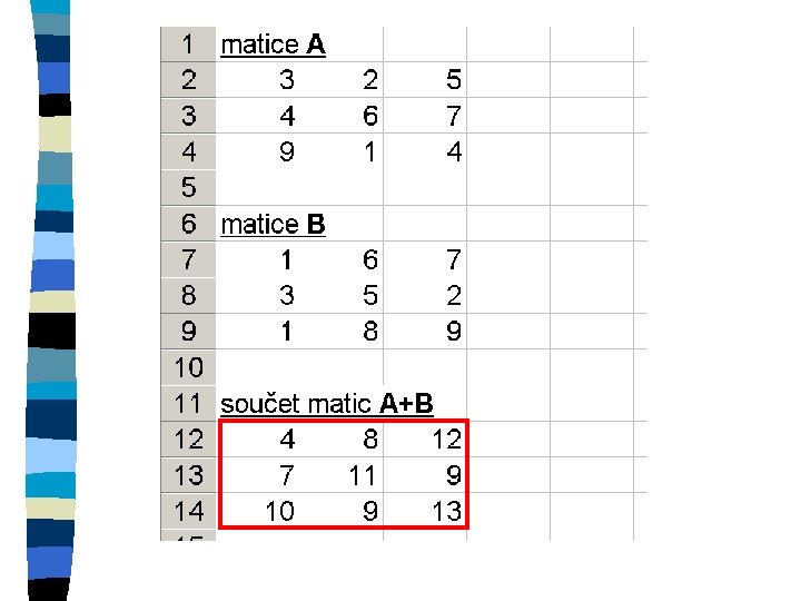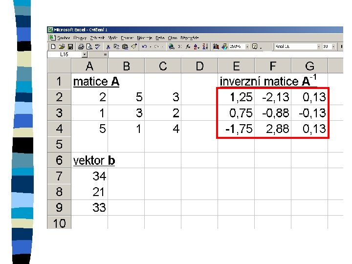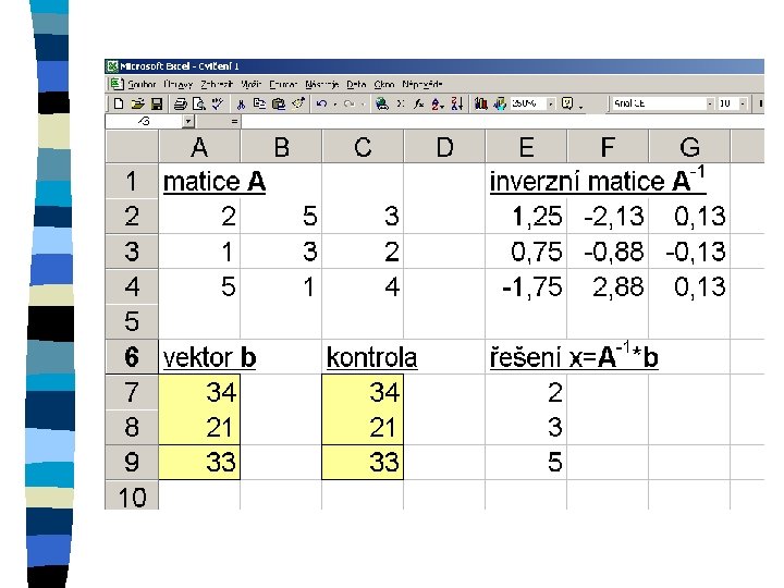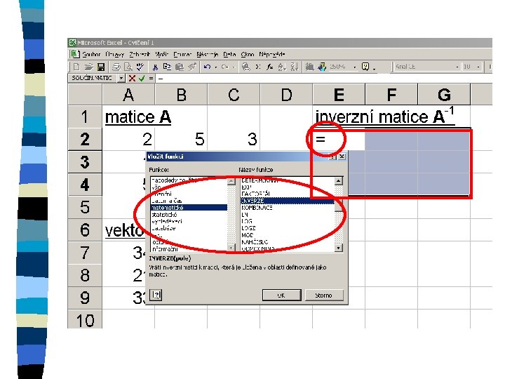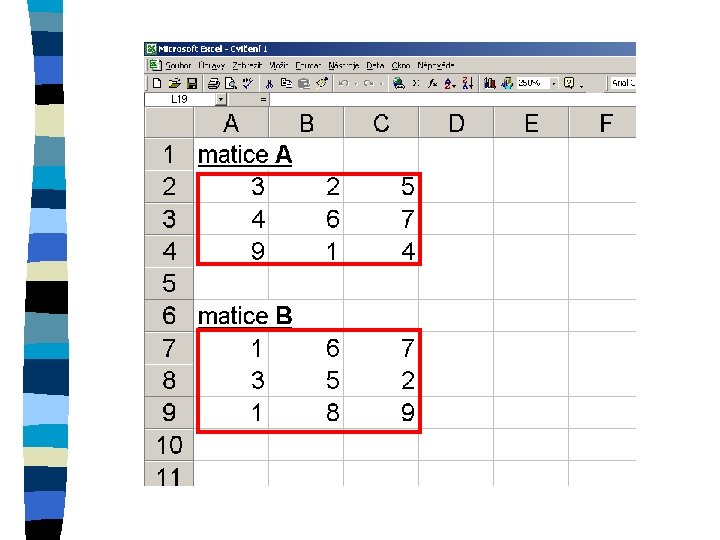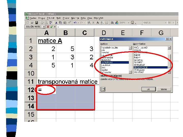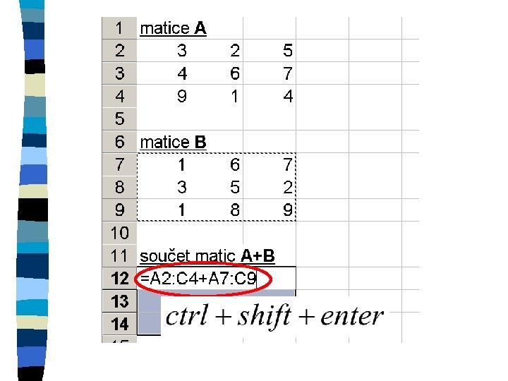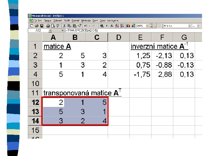 Zkopírování matice n označení oblasti, do které se kopíruje n znaménko = n označení kopírované oblasti n ctrl+shift+enter