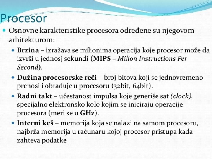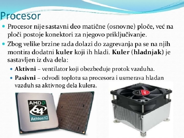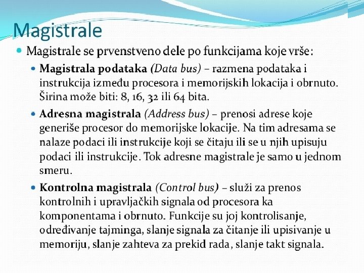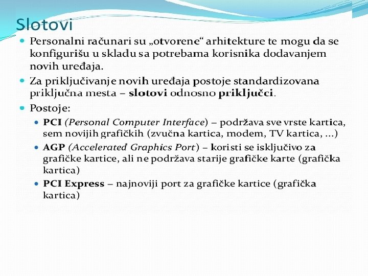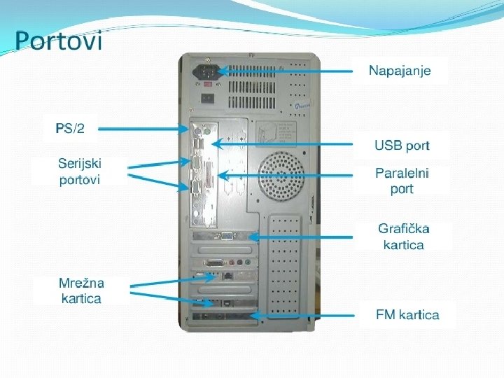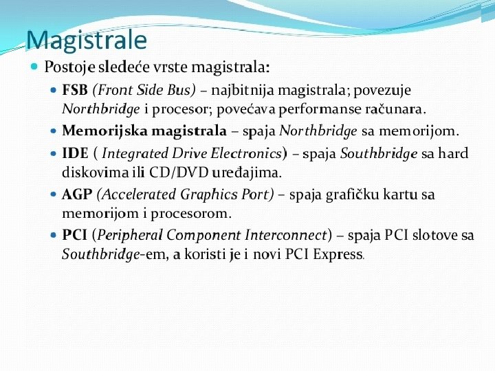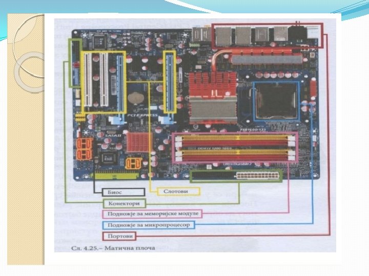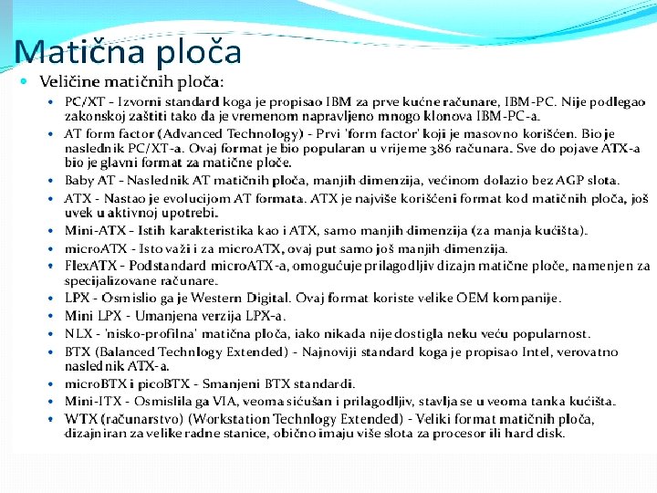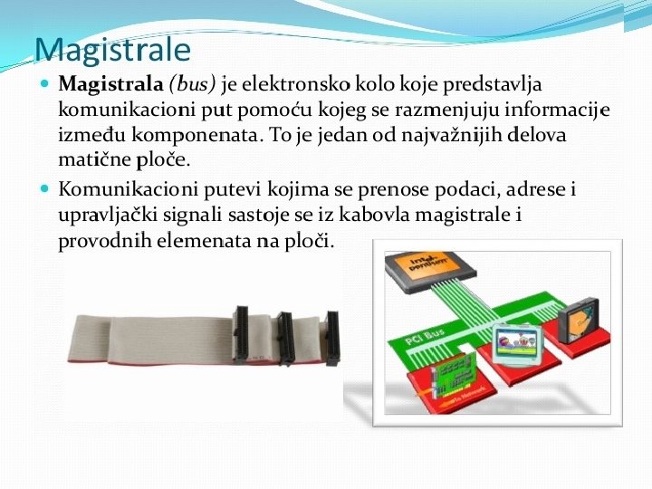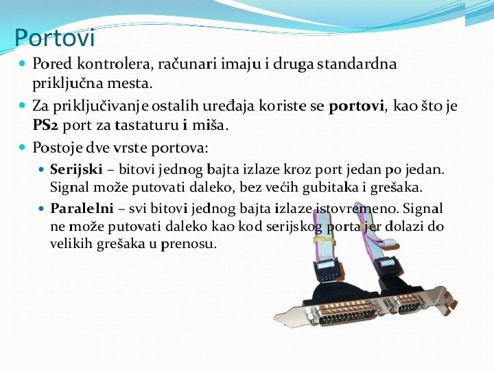 Matična ploča se sastoji od: § BIOS-čip koji testira sve delove računara, svaki put kada se računar uključi �Priključnog mesta za procesor �Priključnog mesta za memoriju �Magistrala-elektronski vodovi kojima se kreću signali između pojedinih elemenata matične ploče Ø Kontrolera (za diskove i disketne jedinice) Ø Priključaka, odnosno slotova ( za kartice-zvučne, grafičke, TV, mrežne, modem, RAM ) Ø Portova (za povezivanje računara sa drugim uređajimamiš, tastatura, kamera. . . ) Mogu biti serijski, paralelni i USB portovi • Elektronike za povezivanje svih elemenata