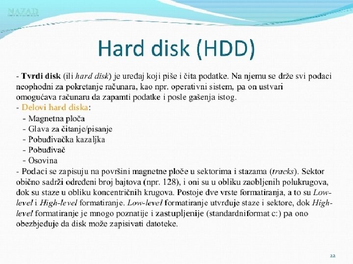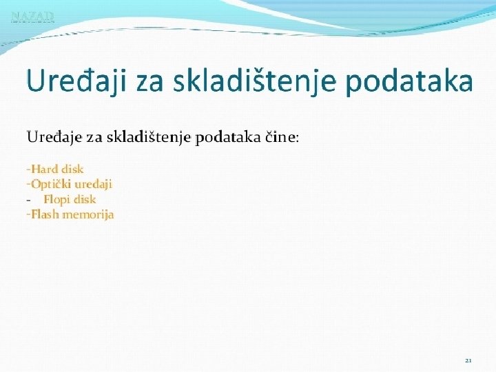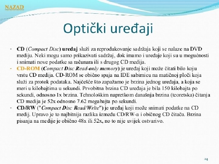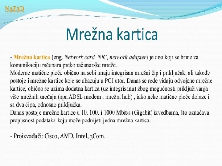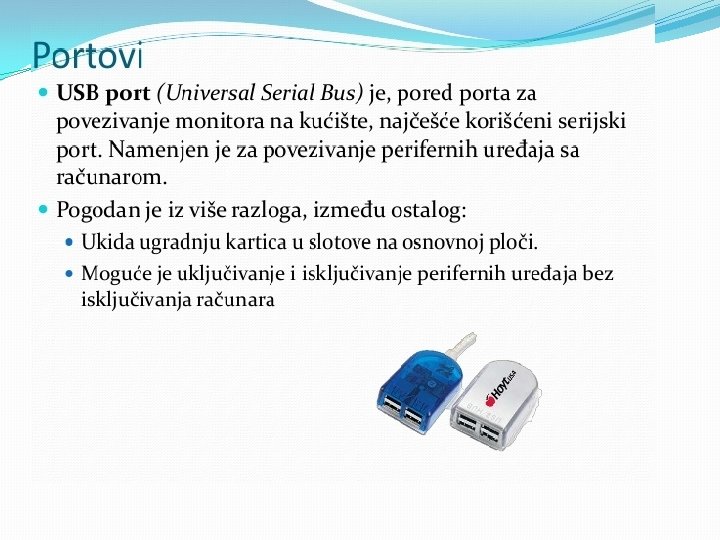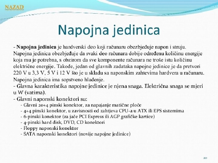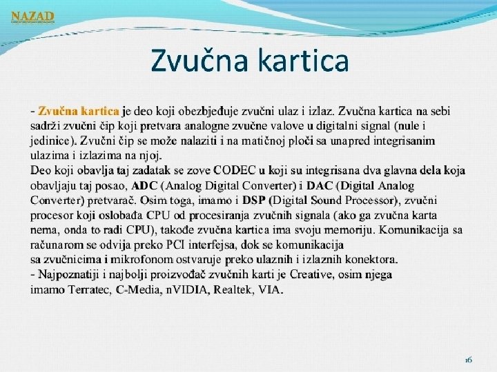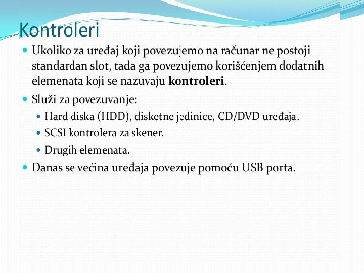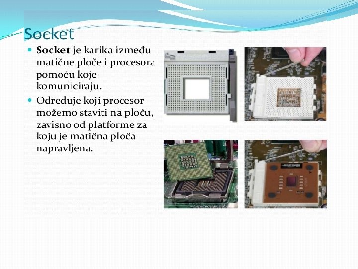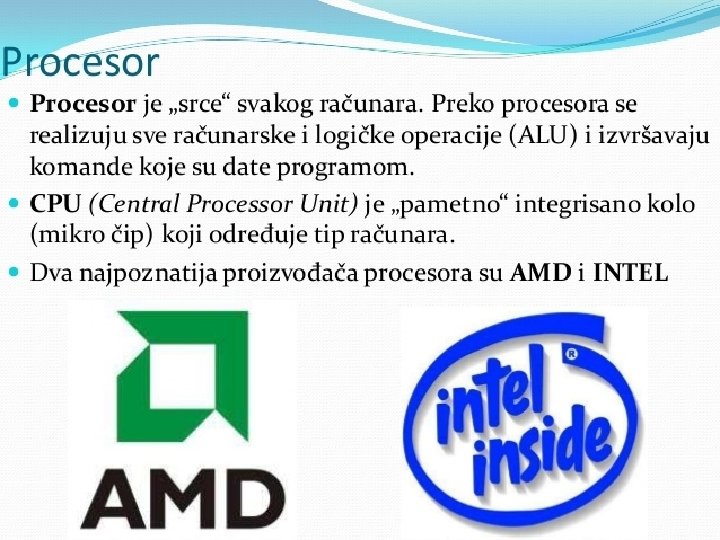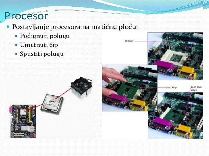 Matična ploča se sastoji od: § BIOS-čip koji testira sve delove računara, svaki put kada se računar uključi �Priključnog mesta za procesor �Priključnog mesta za memoriju �Magistrala-elektronski vodovi kojima se kreću signali između pojedinih elemenata matične ploče Ø Kontrolera (za diskove i disketne jedinice) Ø Priključaka, odnosno slotova ( za kartice-zvučne, grafičke, TV, mrežne, modem, RAM ) Ø Portova (za povezivanje računara sa drugim uređajimamiš, tastatura, kamera. . . ) Mogu biti serijski, paralelni i USB portovi • Elektronike za povezivanje svih elemenata