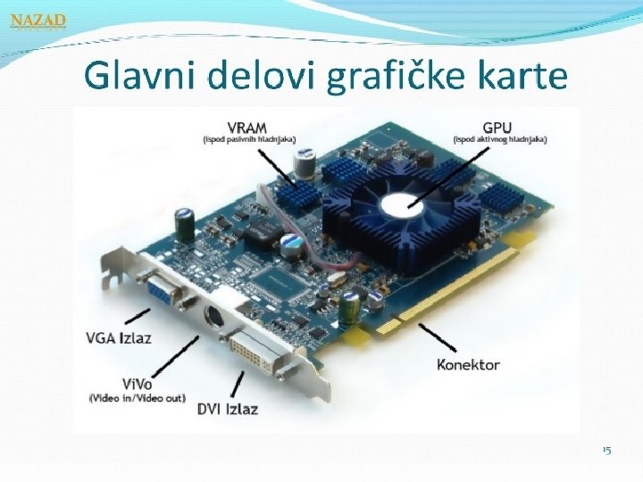 Grafičkia kartica, grafički adapter, VGA kartica ili video kartica daje i obrađuje dvodimenzionalnu ili trodimenzionalnu sliku. Grafički procesor GPU je glavni deo na kartici, a njegova uloga je prevođenje binarnog koda u vidljivu sliku na grafičkom izlaznom uređaju. Princip je jednostavan-CPU u saradnji sa nekim softverom šalje informacije grafičkom procesoru, koji zatim obrađuje dobijene informacije, i šalje ih na monitor. Grafička kartica se ugrađuje u matičnu ploču, obično u AGP ili PCI Express konektor. Glavni delovi grafičke kartice su: PCB (Printed Circuit Board)-štampana ploča na kojoj su svi ostali delovi GPU (Graphich Processing Unit )-grafički procesor, odnosno glavni deo koji prevodi binarni kod u sliku RAM (ili VRAM –Video Random Acces Memory), služi za skladištenje najnužnijih podataka za GPU Konektori PCI, AGP, PCI Express Izlazi : VGA (Video Graphics Array) DVI (Digital Visual Interface) Video in/ Video out (VIVO)