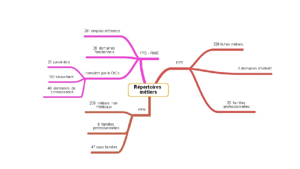 Les outils • Les répertoires des métiers : - Le Répertoire Interministériel des Métiers de l’Etat (RIME) : 261 emplois référence et 26 domaines fonctionnels - Le répertoire des métiers de la fonction publique territoriale du CNFPT : 239 fiches métiers et fonctions, structuré en 5 domaines d’activité et 35 familles professionnelles - Le guide des métiers de l’ANFH : 200 métiers non médicaux organisés en 9 familles professionnelles, subdivisées en 47 sous -familles