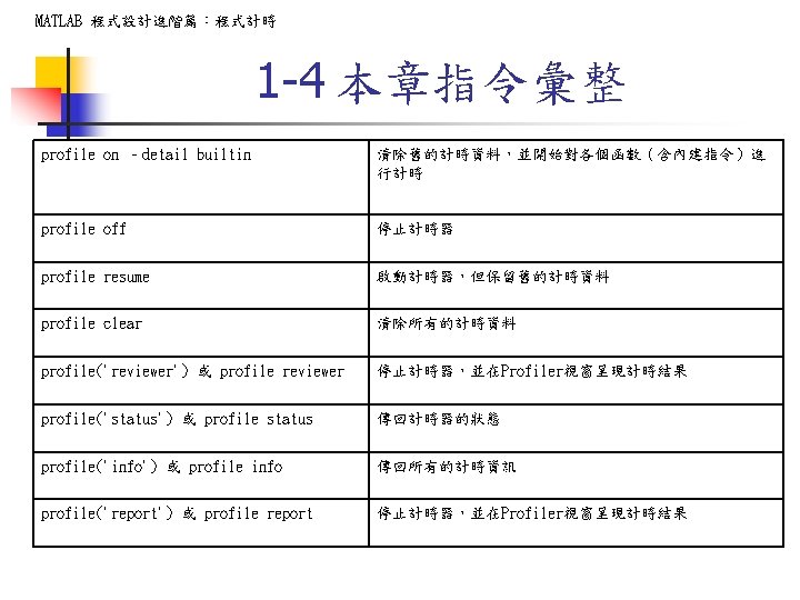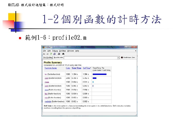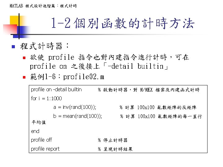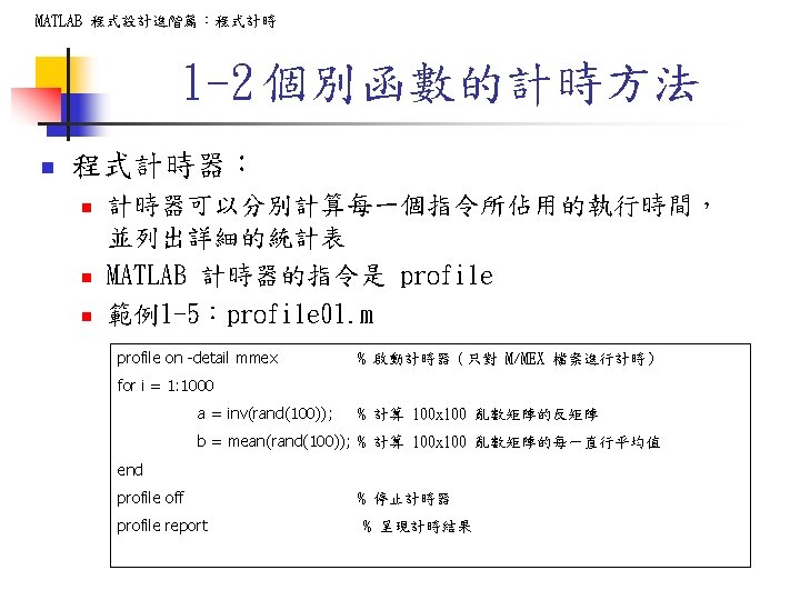 MATLAB 程式設計進階篇:程式計時 1 -3 程式計時器的其他功能 n profile('status'): n n profile(‘status’)可傳回計時器的狀態 例如: >> status = profile('status') n 結果: status = Profiler. Status: 'off' Detail. Level: 'builtin‘ Timer: 'real' History. Tracking: 'off'