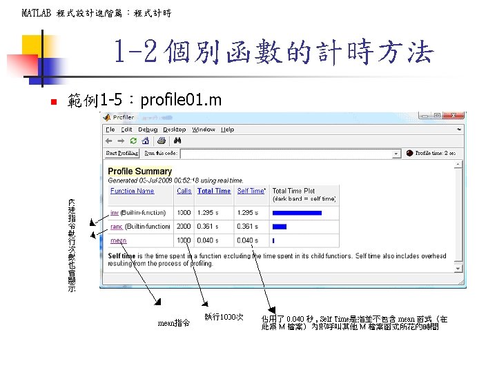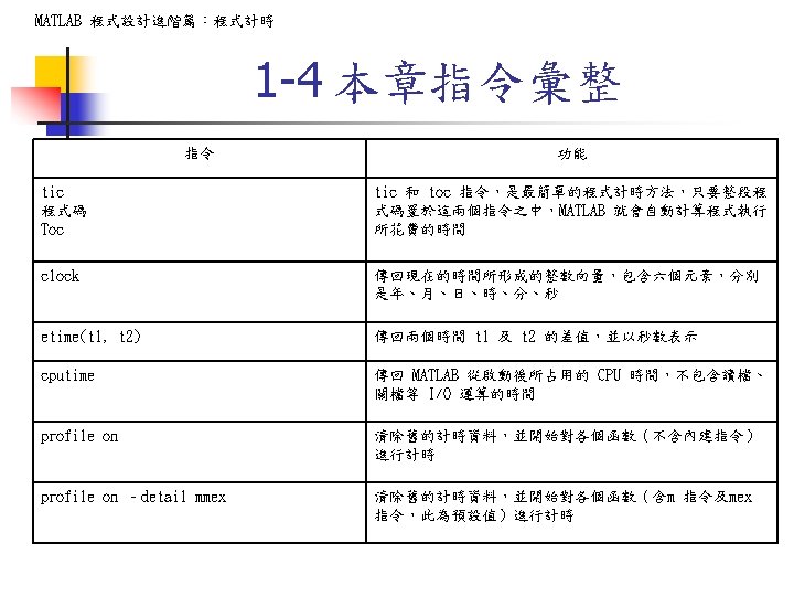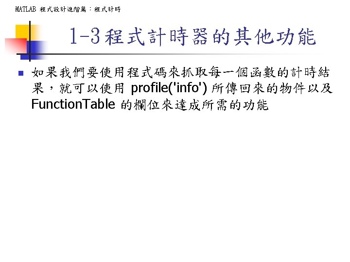 MATLAB 程式設計進階篇:程式計時 1 -3 程式計時器的其他功能 n profile('info'): n n 所有的計時資訊都可由 profile('info') 傳回 例如: >> info = profile('info') n 結果: info = Function. Table: [10 x 1 struct] Function. History: [2 x 0 double] Clock. Precision: 4. 0000 e-008 Clock. Speed: 2500 Name: 'MATLAB'