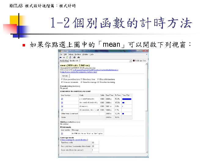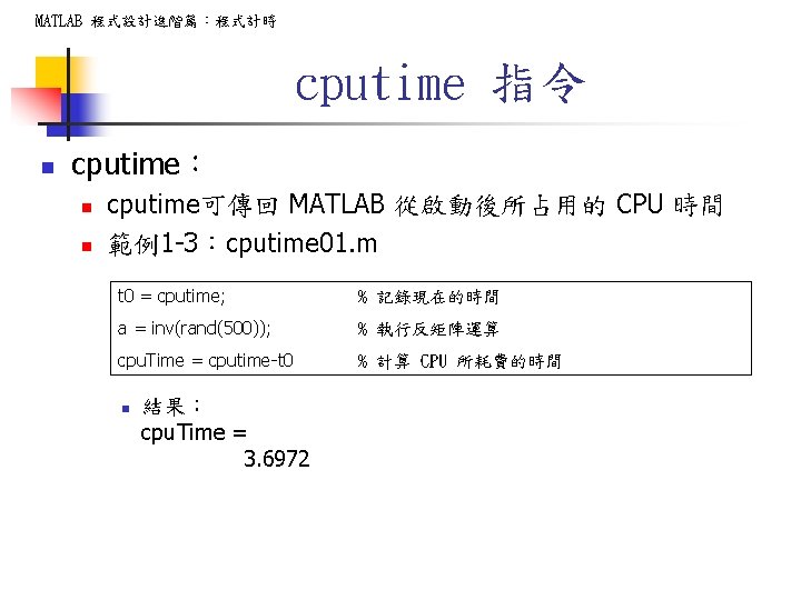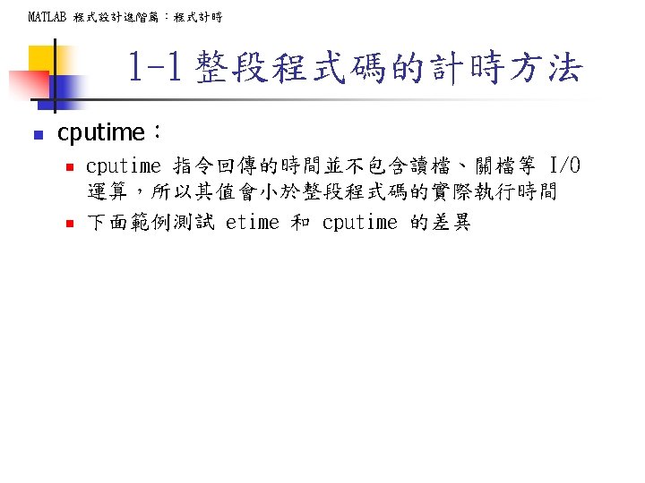MATLAB 程式設計進階篇:程式計時 1 -1 整段程式碼的計時方法 n 範例1 -4:cputime 02. m mat = magic(50); t 0 = clock; for i = 1: 10; mesh(mat); end elapsed. Time = etime(clock, t 0) % 顯示實際經過時間 t 0 = cputime; for i = 1: 10; mesh(mat); end cpu. Time = cputime-t 0 n 結果 : elapsed. Time = 0. 0400 cpu. Time = 0. 0312 % 顯示 CPU 佔用時間