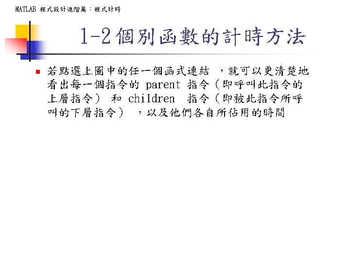 MATLAB 程式設計進階篇:程式計時 1 -3 程式計時器的其他功能 n 取得與 inv 指令相關的計時資訊 n 例如: >>info. Function. Table(2) n 結果: ans = Complete. Name: 'C: Program FilesMATLAB 71binwin 32numerics. dll>inv' Function. Name: 'inv' File. Name: 'C: Program FilesMATLAB 71binwin 32numerics. dll' Type: 'Builtin-function' Num. Calls: 1000 Total. Time: 1. 3820 Total. Recursive. Time: 1. 3820 Children: [0 x 1 struct] Parents: [0 x 1 struct] Executed. Lines: [0 x 4 double] Is. Recursive: 0 Accelerator. Messages: {1 x 0 cell}