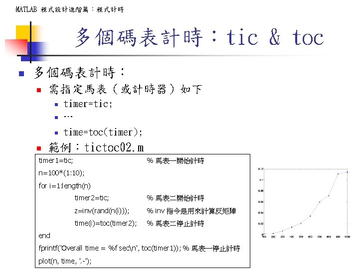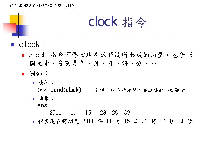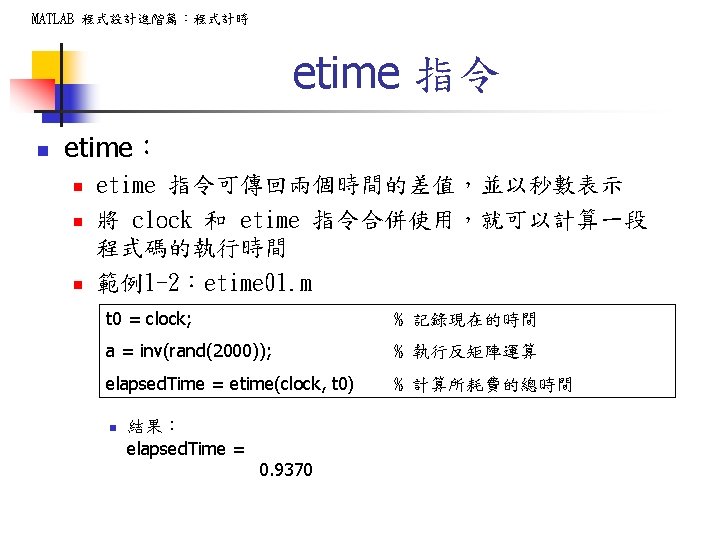 MATLAB 程式設計進階篇:程式計時 1 -1 整段程式碼的計時方法 n 相關指令 n n tic & toc clock & etime cputime 本章範例之執行環境 n n OS: Windows 7 CPU: Intel Core i 7 -2670 QM, 2. 20 GHz RAM: 8 GB MATLAB: 7. 12. 0. 635 (R 2011 a)