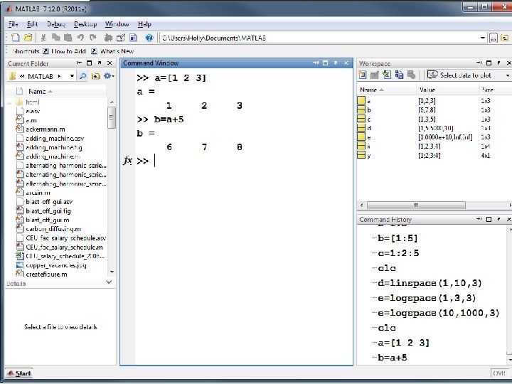 I saved this file as example. m Notice that it now appears in the current directory When I execute the file, the figure appears on top of the MATLAB desktop