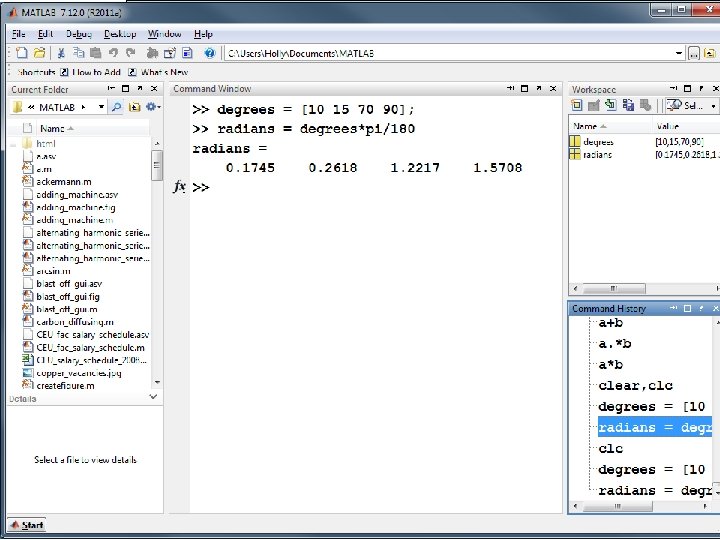 The matrix capability of MATLAB makes it easy to do repetitive calculations • For example, assume you have a list of angles in degrees that you would like to convert to radians. – First put the values into a matrix. – Perform the calculation
