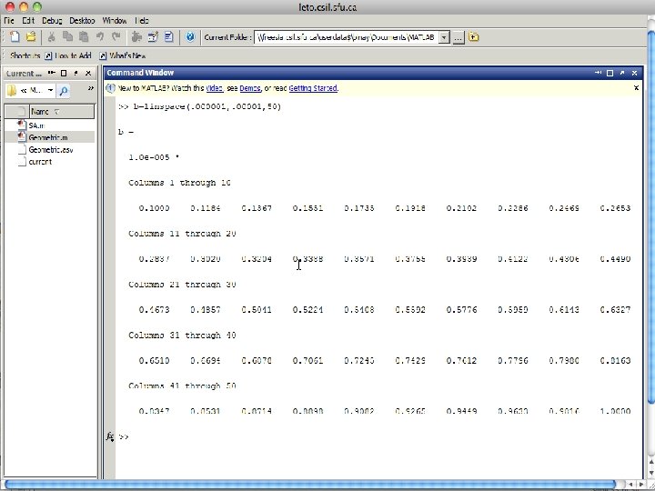 MATLAB automatically saves to a. mat file • If you want to save to another format, such as. dat, you need to explicitly tell the program save <file_name> <variable_list> -ascii Again – Remember that the only things being saved are the values stored in the workspace window – not the commands from the command window