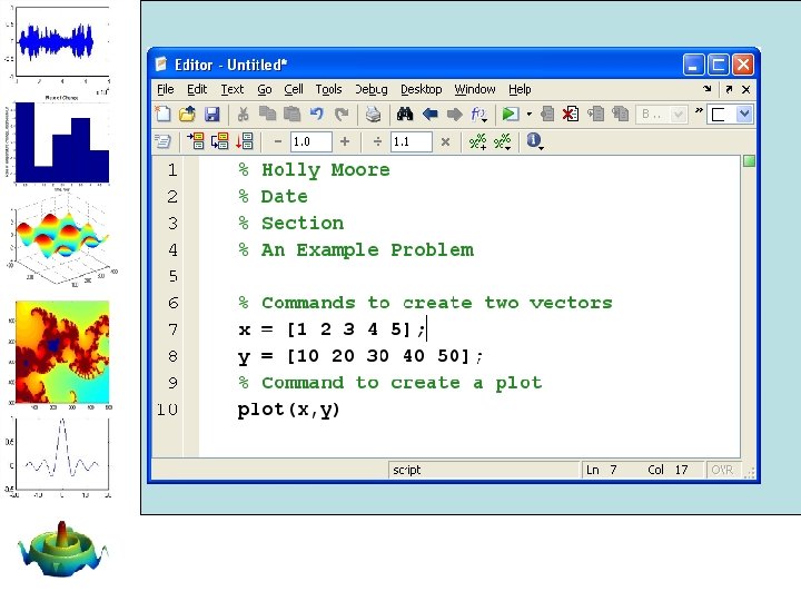 Script M-files • If you want to save your work, (the commands you entered) you need to create an M-file • File->New->M-file • Type your commands in the edit window that opens