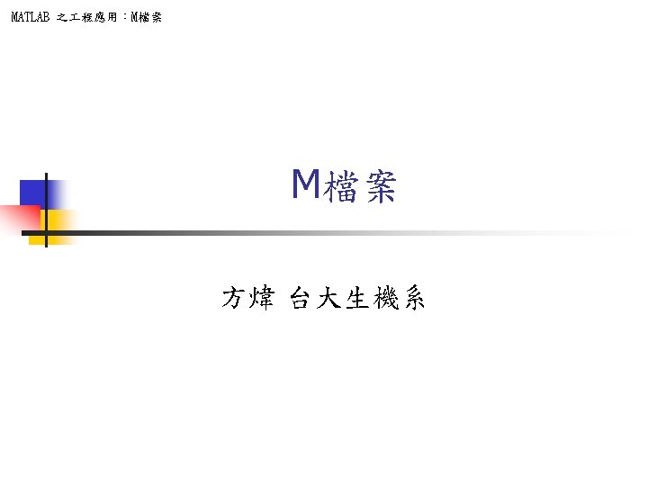 MATLAB 之 程應用:M檔案 M檔案的執行 n 欲執行 script 01. m, n 在指令視窗下輸入 script 01 即可 >> script 01 x(1) = 1 is positive x(2) = 4 is positive x(3) = -2 is negative or zero x(4) = 3 is positive x(5) = -1 is negative or zero x(6) = -5 is negative or zero
