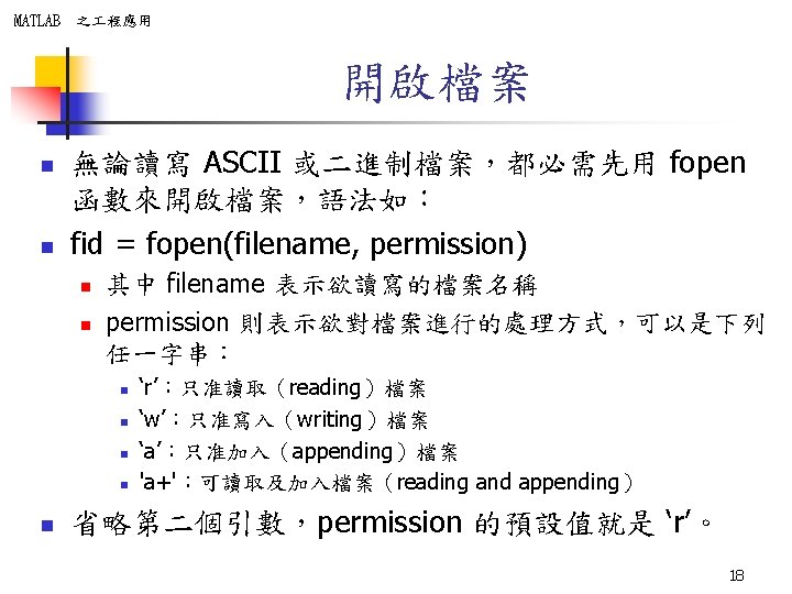 MATLAB 之 程應用 Ex: fopen 02. m n 若開啟成功,則傳回的 fid 是一個大於 2 的 整數,而且傳回的 message 是一個空字串, 例如: [fid, message] = fopen('fopen 02. m', 'r'); fprintf('fid = %dn', fid); fprintf('message = %sn', message); fid = 3 message = 21