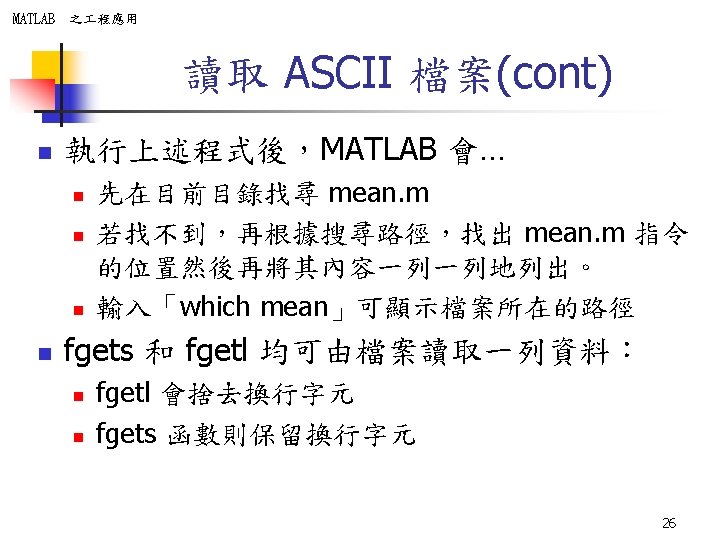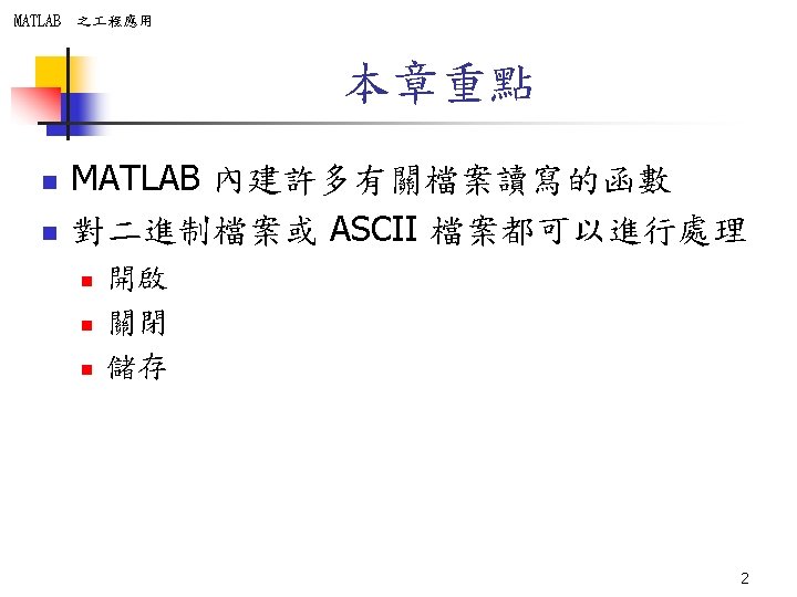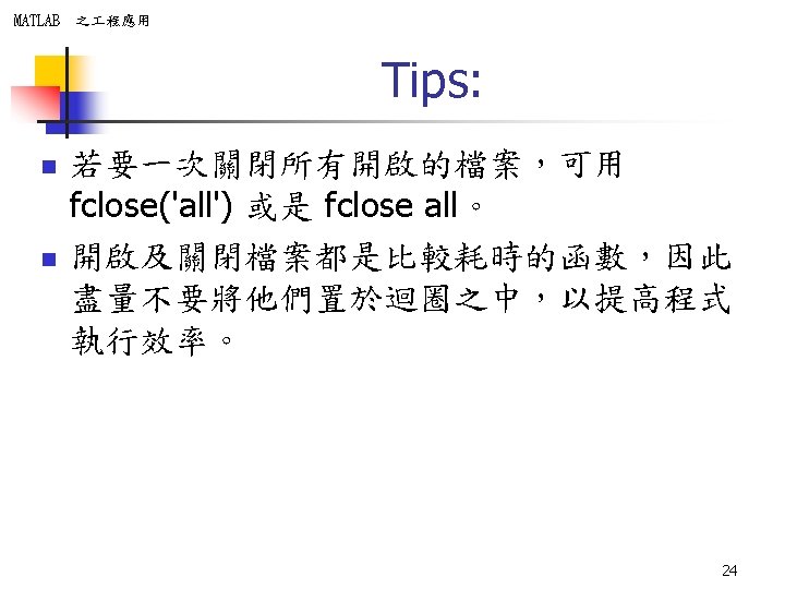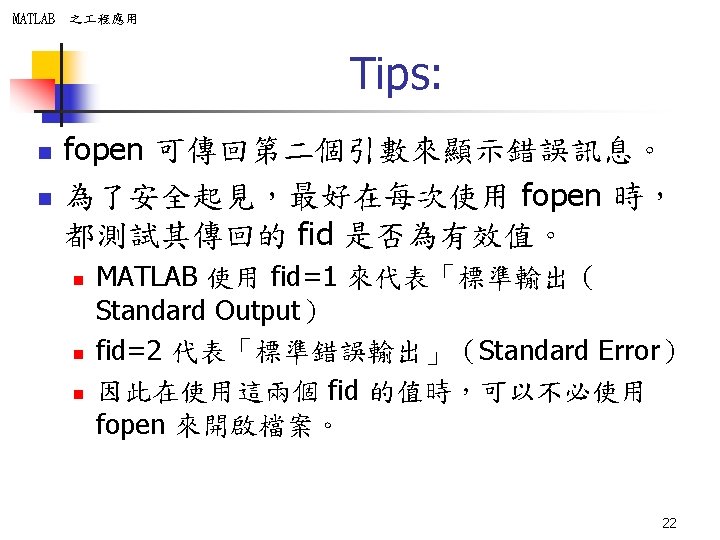 MATLAB 之 程應用 Ex: fopen 01. m [fid, message] = fopen('no_such_file', 'r'); fprintf('fid = %dn', fid); fprintf('message = %sn', message); fid = -1 message = Sorry. No help in figuring out the problem. . . n n 上例可知當檔案不存在時,回傳的 fid 是 – 1 同時 message 會包含相關的錯誤資訊。 20