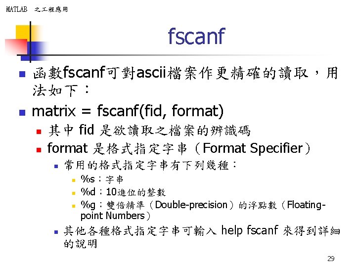 MATLAB 之 程應用 Ex: fscanf 01. m n 有一文字檔 test. txt 如下: 1 4 9 16 25 36 49 64 81 100 欲使用 fscanf 指令讀取其內容,可輸 入如下: n my. Data = 1 4 9 16 25 fid = fopen('test. txt', 'r'); 36 n my. Data = fscanf(fid, '%g'); 49 n fclose(fid); n my. Data n 64 81 % 顯示 my. Data 100 30
