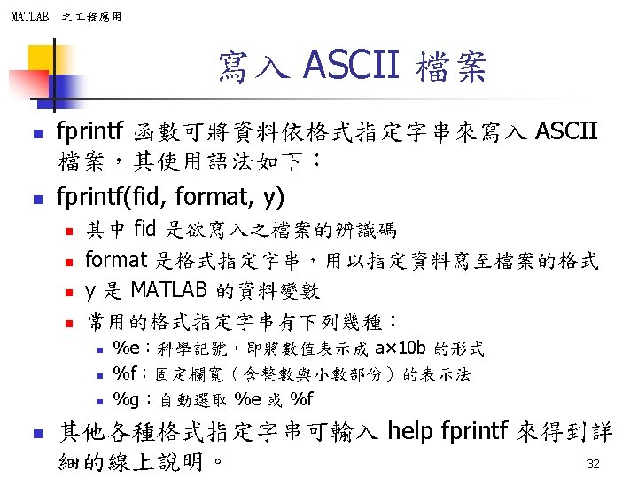 MATLAB 之 程應用 Ex: sscanf n n n sscanf 函數和 fscanf 的功能很類似 sscanf 函數從字串(strings)中讀取資料 ex:sscanf. m str = num 2 str([pi, sqrt(2), log 10(3)]) %建立一字串str retrieved = sscanf(str, ‘%g’) %擷取str中的double str = 3. 1416 1. 4142 0. 47712 retrieved = 3. 1416 1. 4142 0. 4771 31