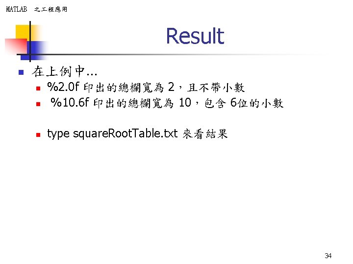 MATLAB 之 程應用 Ex: fprintf 01. m n 將平方根表寫入檔案 x = 1: 10; y = [x; sqrt(x)]; fid = fopen('square. Root. Table. txt', 'w'); fprintf(fid, 'Table of square root: rn'); fprintf(fid, '%2. 0 f => %10. 6 frn', y); fclose(fid); dos('start square. Root. Table. txt'); % 開啟 square. Root. Table. txt 33