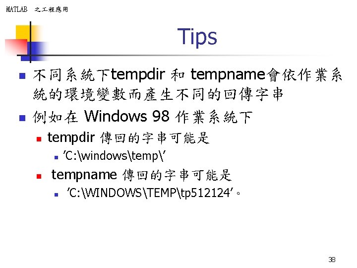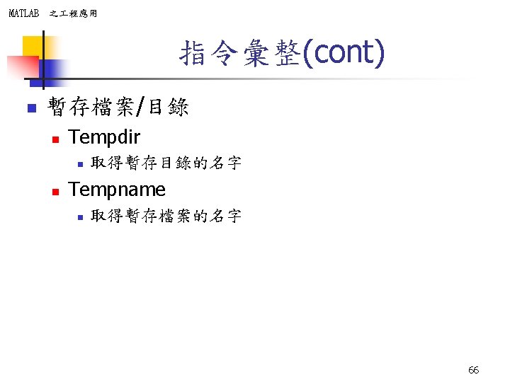 MATLAB 之 程應用 暫存檔案 欲開啟一暫存檔案,可用 tempname,如下: >> filename = tempname n Result: n filename = C: DOCUME~1jangLOCALS~1Temptp 273132 37