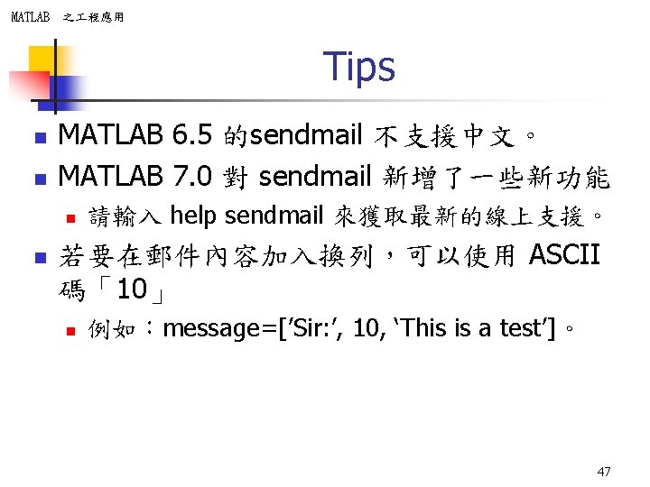 MATLAB 之 程應用 Ex: sendmail 01. m to = {'email 1@aaa. bbb. ccc', 'email 2@aaa. bbb. ccc'}; subject = 'Test email from a MATLAB program'; message = 'This is a test email sent via sendmail. '; attachment = {'c: windowsmatlab. ini'}; sendmail(to, subject, message, attachment); n 請將 to 的內容改為你自己本身的電子郵件, 並試著執行一次,以確認此程式碼的正確性。 46
