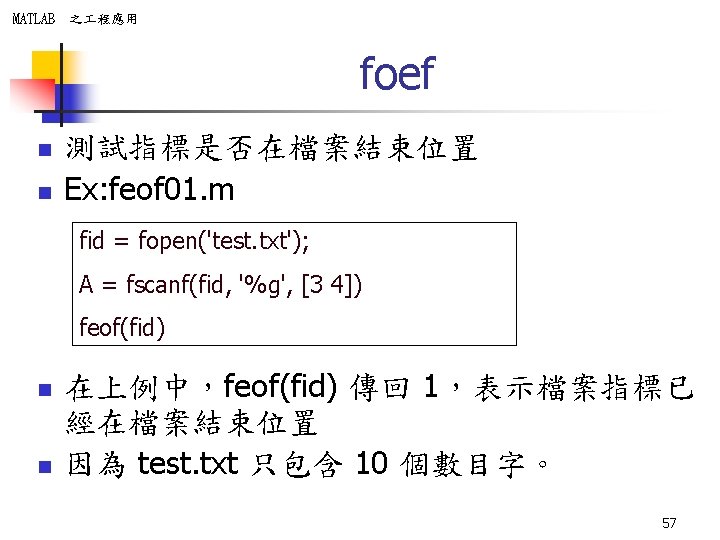 MATLAB 之 程應用 Ex: fread 02. m n fread 函數可用第二個輸入引數來控制傳回矩 陣的大小 fid = fopen('test 2. txt', 'r'); my. Data = fread(fid, 4) % 只讀 4 個位元組 fclose(fid); my. Data = 84 105 115 50