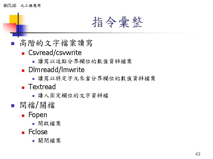 MATLAB 之 程應用 Ex: fread 03. m fid = fopen('test 2. txt', 'r'); my. Data = fread(fid, [2 3]) fclose(fid); n Result: my. Data = 84 105 32 104 115 105 n 此時 my. Data 為 2 X 3 的矩陣。 n p. s. 上例中為長度 4的向量 51