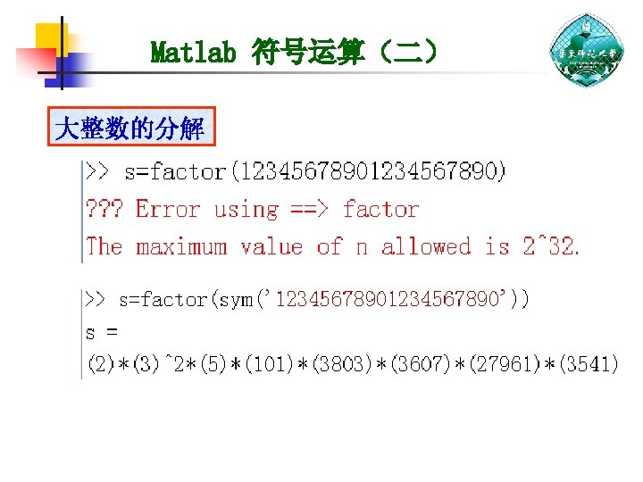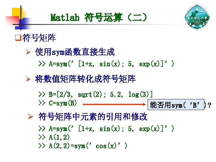 Matlab 符号运算(二) 例:设 y=sin(ax), 求 >> syms a x >> y=sin(a*x) >> A=diff(y, x) A=cos(a*x)*a >> B=diff(y, a) B=cos(a*x)*x >> C=diff(y, x, 2) C=-sin(a*x)*a^2 >> D=diff(y, a, 2) D=-sin(a*x)*x^2