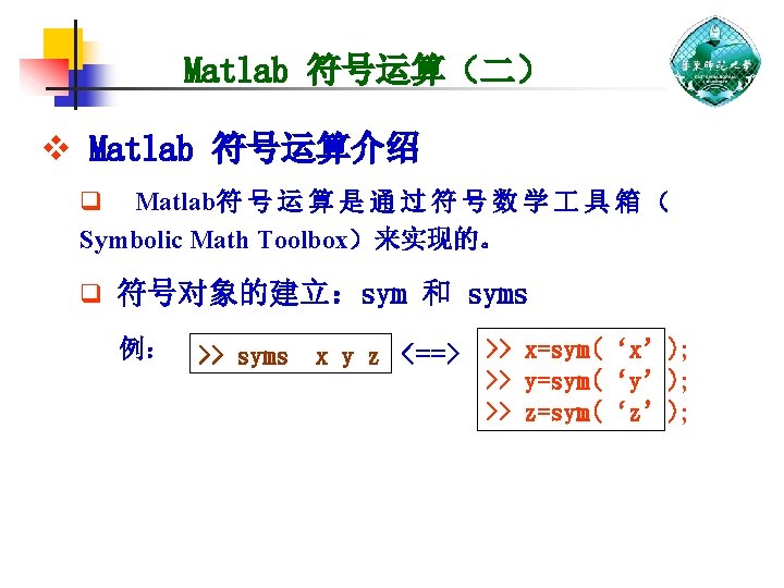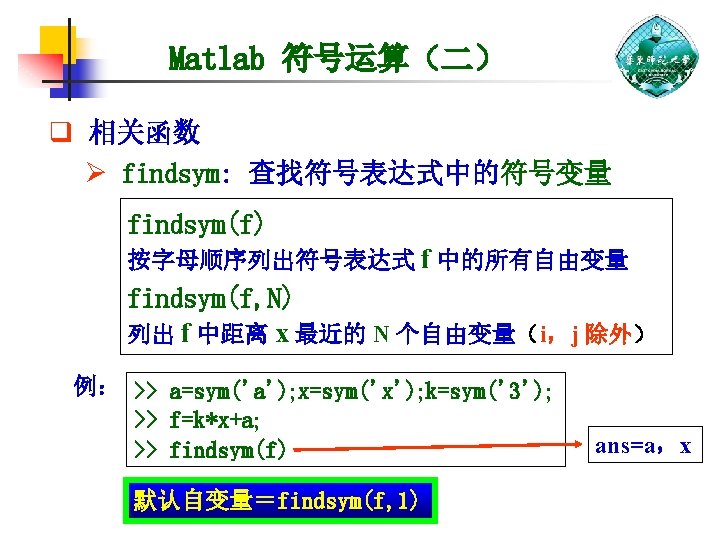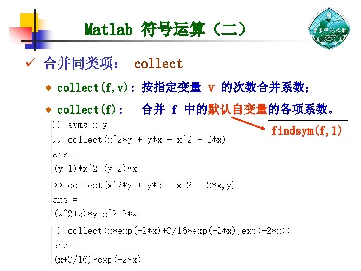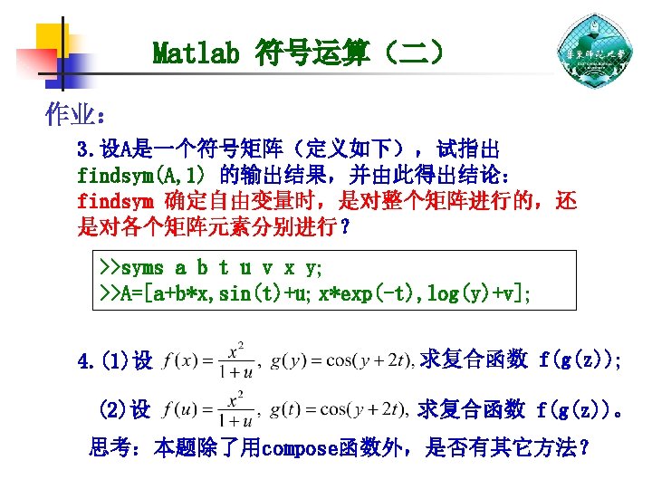 Matlab 符号运算(二) 作业: exp(i*x)? 1. 化简 2. >> >> syms a b x X Y k=sym(’ 3’); z=sym('c*sqrt(delta)+y*sin(theta)'); f=a*z*X+(b*x^2+k)*Y; 试写出下面命令的结果, 上机验证,并说明理由: >> >> findsym(f) findsym(f, 1) findsym(f, 2) findsym(f, 3)