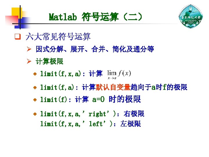 Matlab 符号运算(二) 例:求极限 >> syms h n x >> L=limit((log(x+h)-log(x))/h, h, 0) >> M=limit((1 -x/n)^n, n, inf) >> syms x >> L=limit(abs(x)/x, x, 0, ’left') >> R=limit(abs(x)/x, x, 0, ’right') L=1/x M=exp(-x) L=-1 M=1