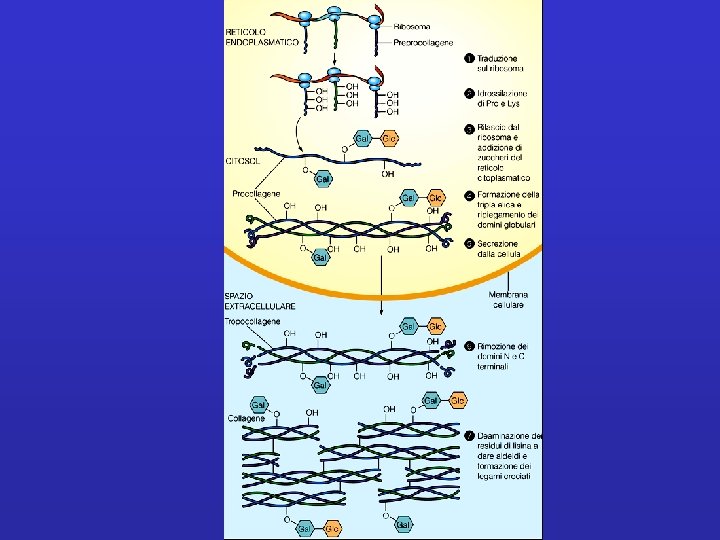 Singole molecole di collagene sono strutture lineari costituite da 3 catene polipeptidiche. Le singole catene, dette catene , si avvolgono a formare un’elica sinistrorsa a passo lungo. I residui di Pro, a spaziatura regolare, sono importanti per la stabilizzazione di questa struttura elicoidale. 3 catene a si associano tra loro a formare una tripla elica destrorsa, relativamente rigida; tale struttura è possibile grazie all a spaziatura regolare dei residui di Gly (stanno nell’asse centrale). La tripla elica è responsabile della natura fibrosa. A seconda del tipo di collagene, la tripla elica può essere continua, o può contenere regioni che danno origine a strutture a conformazione meno ordinata. Questi elementi fungono da regioni cardine e danno maggiore flessibilità. Tripletta Gly-X-Y– X: Pro; Y: Hypro