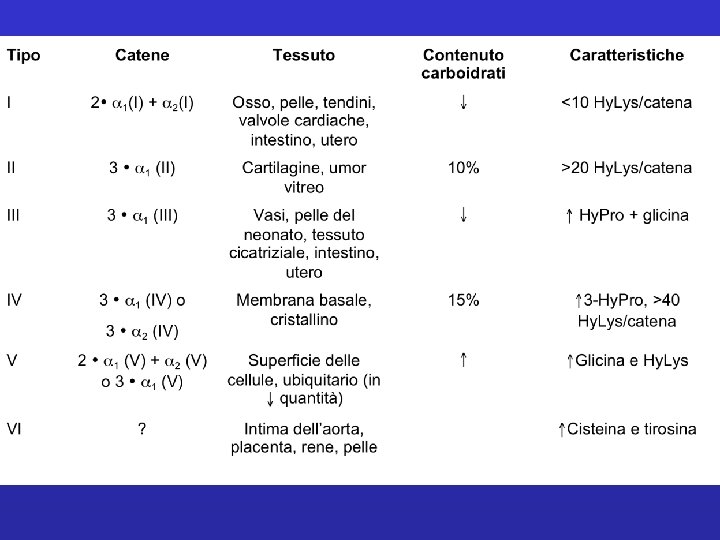 3 catene a si associano tra loro a formare una tripla elica destrorsa, relativamente rigida; tale struttura è possibile grazie all a spaziatura regolare dei residui di Gly (stanno nell’asse centrale). La tripla elica è responsabile della natura fibrosa. Ø 1. 5 nm diametro Ø Almeno 28 differenti topi di collagene Ø le tre α-chains possono essere uguali (collagen II) o diverse (collagen I) A seconda del tipo di collagene, la tripla elica può essere continua, o può contenere regioni che danno origine a conformazione meno ordinata. Questi elementi fungono da regioni cardine e danno maggiore flessibilità.