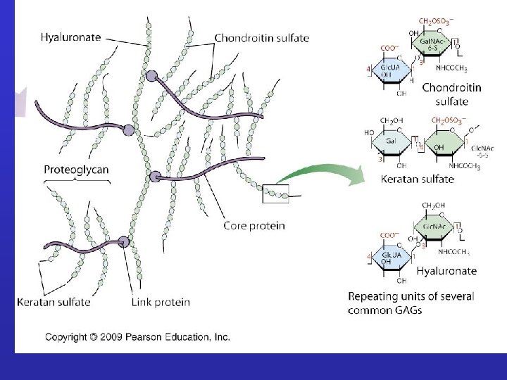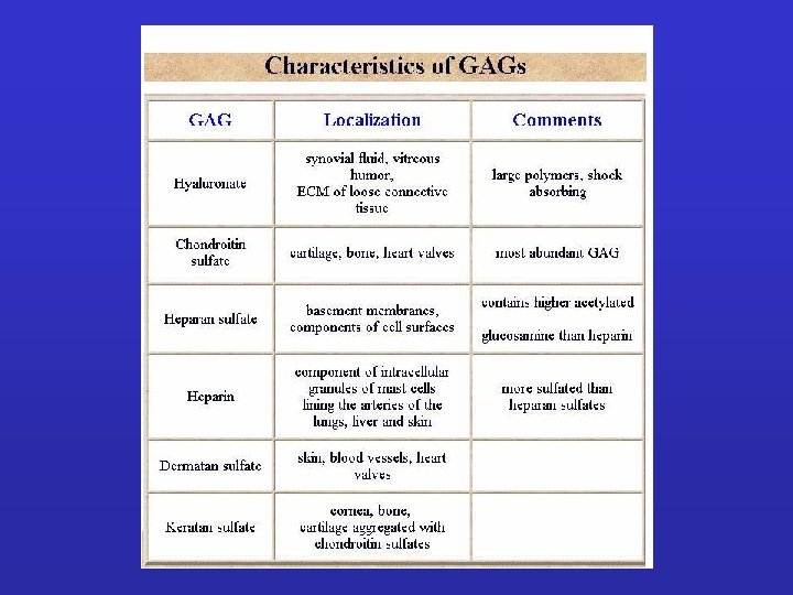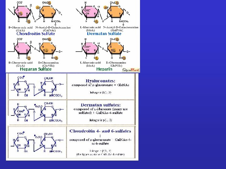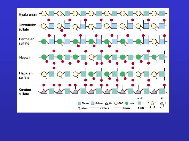 GLICOSAMMINOGLICANI: Sono catene polisaccaridiche non ramificate composte da unità ripetute di disaccaridi. Uno degli zuccheri è sempre uno zucchero amminico (nella maggior parte dei casi è solfato). Il secondo zucchero è di solito un acido uronico (glucuronico o iduronico) I GLICOSAMINOGLICANI OCCUPANO SPAZIO E FORMANO GEL IDRATATI. I GAG che spesso sono legati a proteine formando proteoglicani sono sintetizzati nell'apparato del Golgi dove in seguito a modifiche post-trascrizionali le unità disaccariche vengono aggiunte ai core proteici.